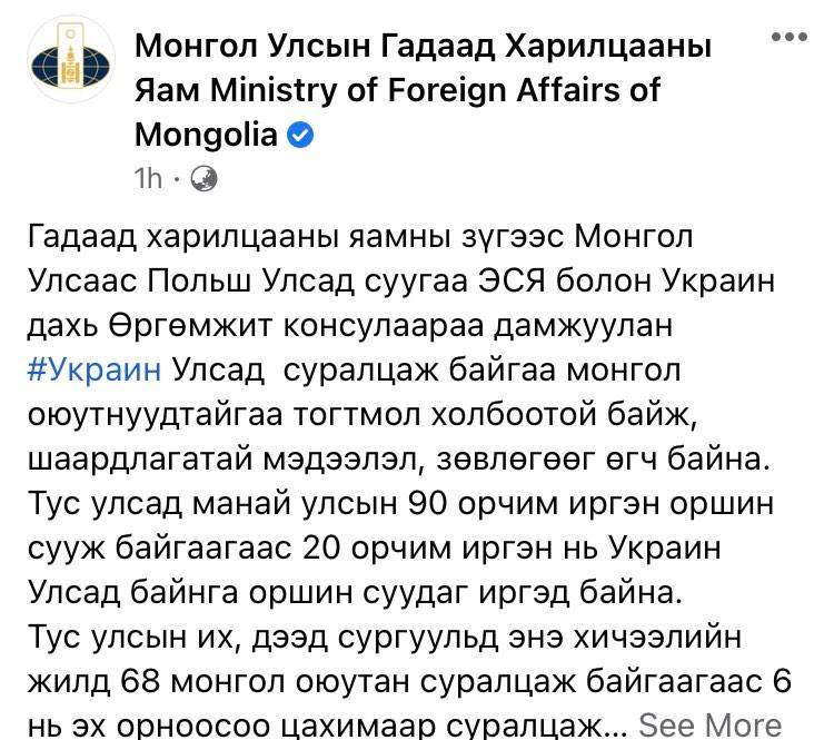 Гадаад харилцааны яамны зүгээс Монгол Улсаас Польш Улсад суугаа ЭСЯ болон Украин дахь Өргөмжит консулаараа дамжуулан Украин Улсад суралцаж байгаа монгол оюутнуудтайгаа тогтмол холбоотой байж, шаардлагатай мэдээлэл, зөвлөгөөг өгч байгаа аж.