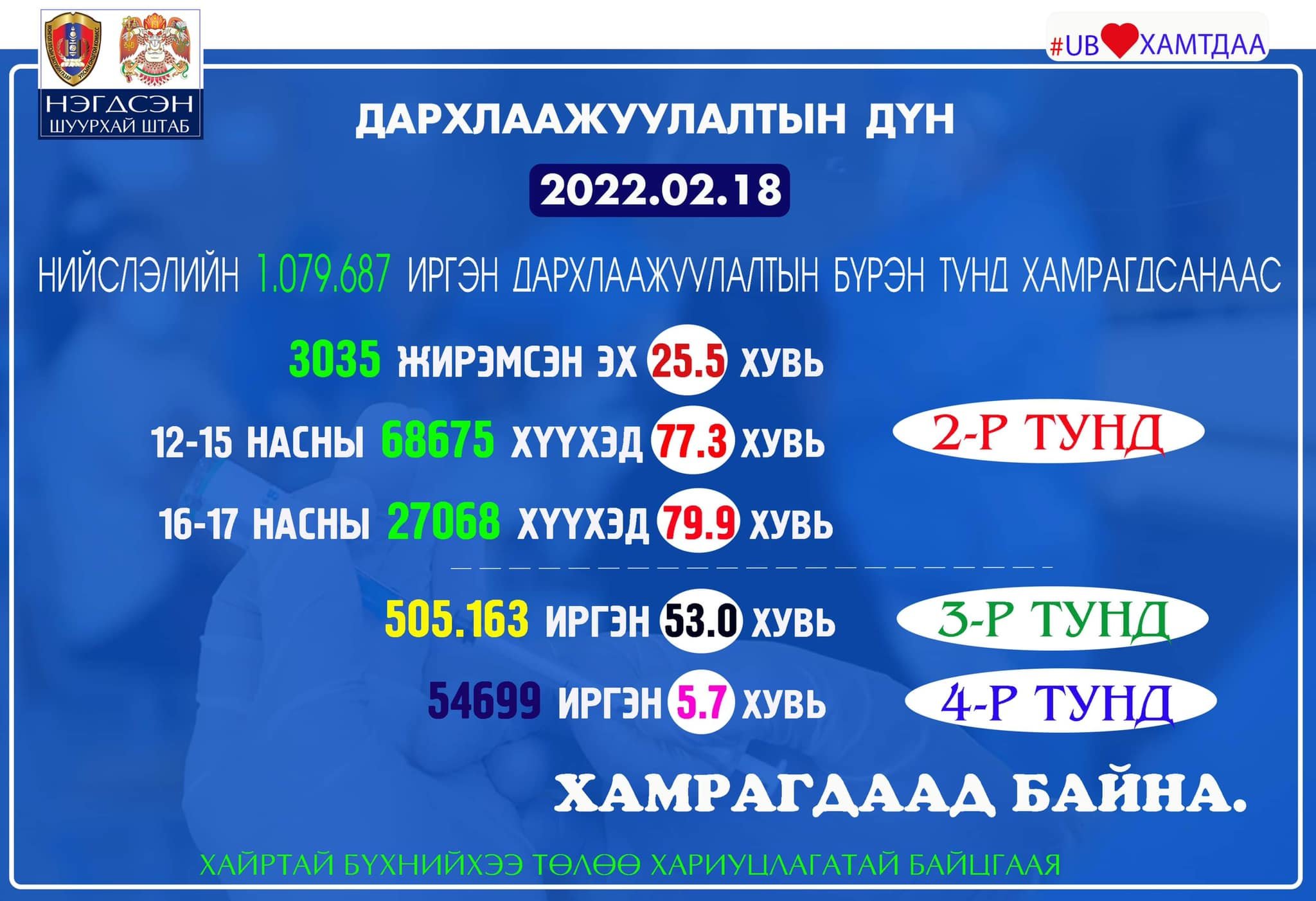 Өчигдөр нийслэлийн хэмжээнд I тунд 31, II тунд 54, III тунд 337, IV тунд 431, нийт 853 иргэнийг дархлаажууллаа. Вакцинжуулалт эхэлснээс хойш нийслэлийн зорилтот хүн амын I тунгийн хамралт 75.1 хувь, II тунгийн хамралт 72 хувь, III тунгийн хамралт 53 хувь, нэмэлт IV тунгийн хамрагдалт 5.7 хувь байна.