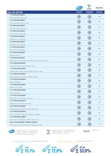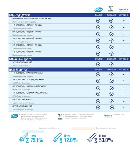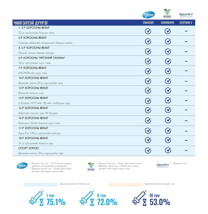 Өнөөдөр Улаанбаатар хотод суурин 157 цэгт 157 багийн 749 эмч, ажилтан ажиллана. Та өөрт ойр вакцины аль ч цэгт очиж дархлаажуулалтад хамрагдах боломжтой. Дархлаажуулалтын цэгүүд 09:00-17:30 цаг хүртэл ажиллана.