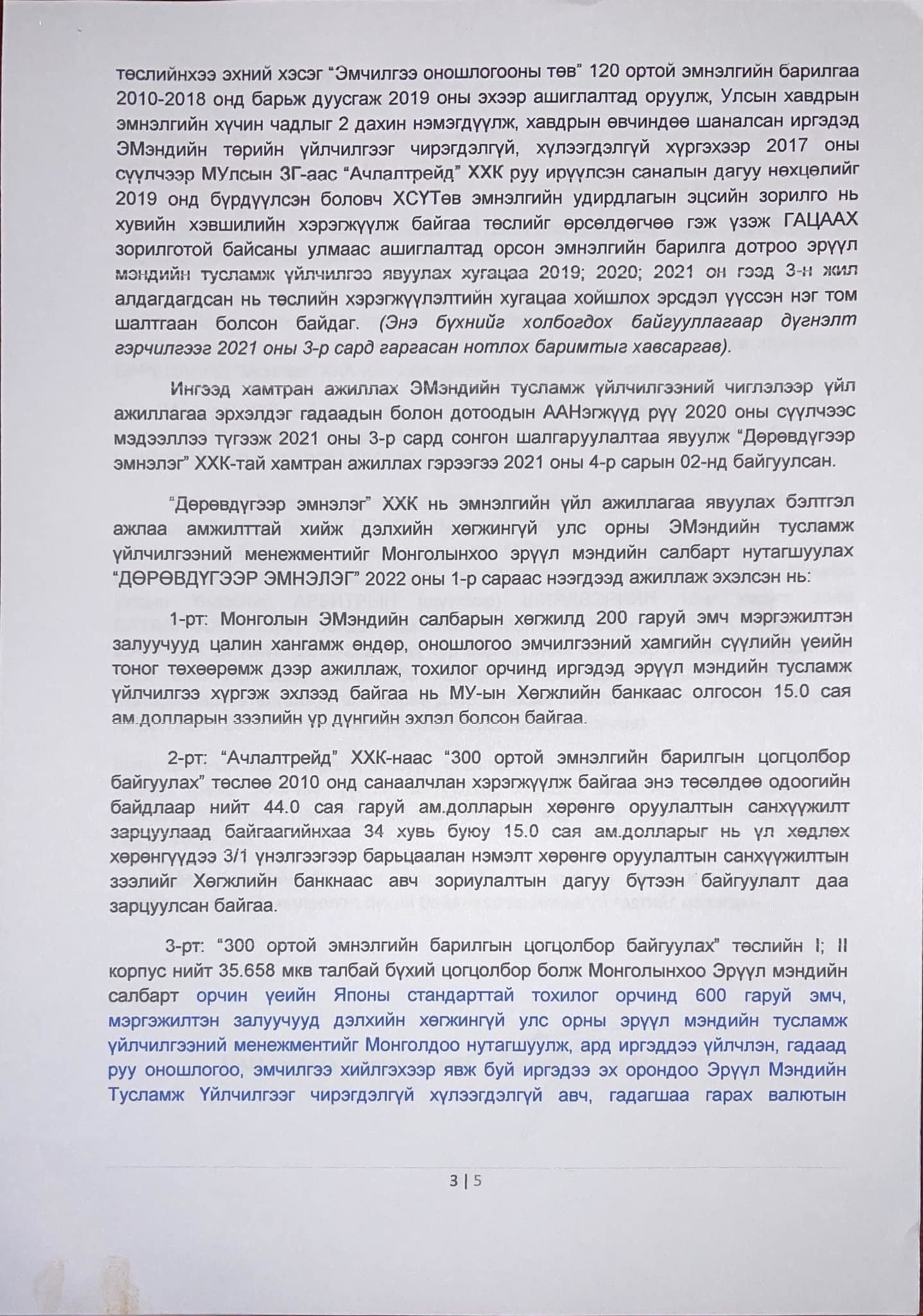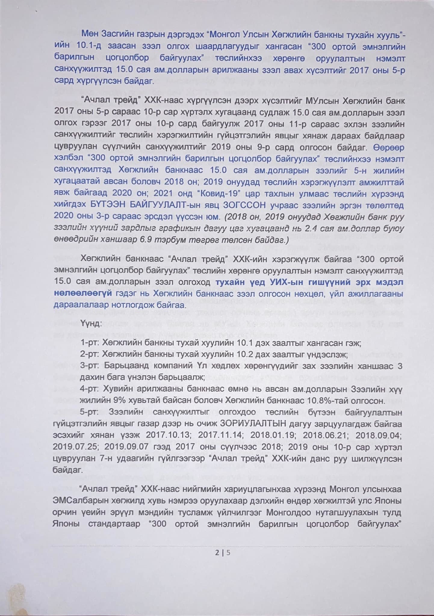 2018 он, 2019 онд Хөгжлийн банк руу зээлийн хүүний зардлыг графикийн дагуу цаг хугацаанд нь 2.4 сая ам.доллар буюу өнөөдрийн ханшаар 6.9 тэрбум төгрөг төлсөн" гэдгийг тайлбартаа дурджээ.