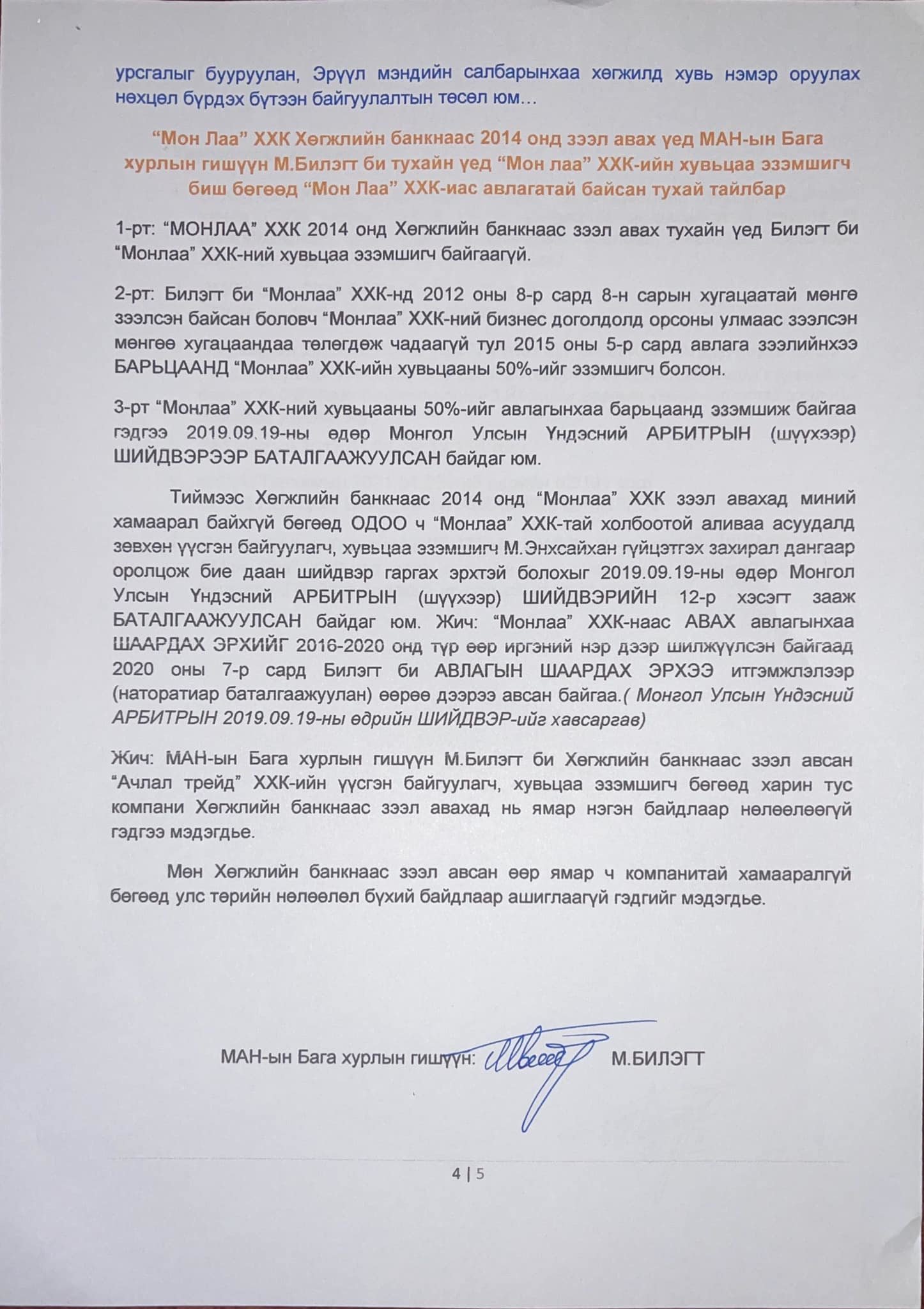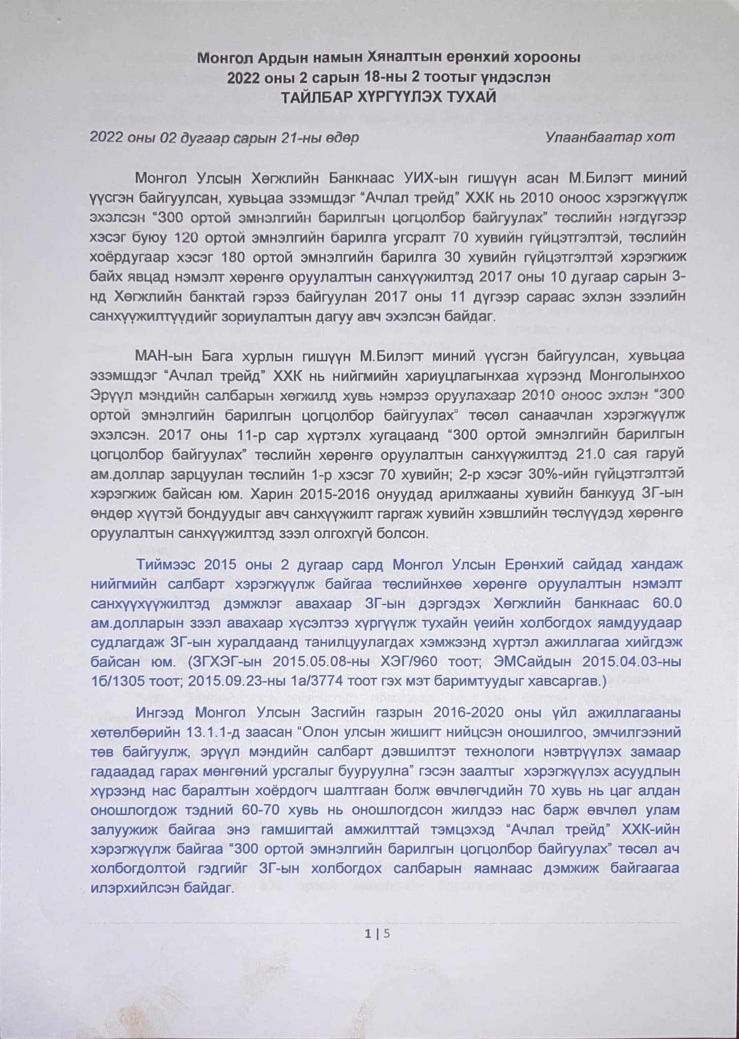 МАН-ын Хяналтын Ерөнхий хороо хуралдаж, Хөгжлийн банкны зээлтэй нэр холбогдсон найман хүнээс тайлбар авах шийдвэрийг гаргасан. Тэд эхнээсээ тайлбар өгөөд эхэлжээ. УИХ-ын гишүүн асан М.Билэгт "Миний үүсгэн байгуулсан, хувьцаа эзэмшдэг “Ачлал трейд” ХХК нь 2010 оноос хэрэгжүүлж эхэлсэн “300 ортой эмнэлгийн барилгын цогцолбор байгуулах” төслийн нэмэлт санхүүжилтэд Хөгжлийн банкнаас 15.0 сая ам.долларын зээлийг 5 жилийн хугацаатай авсан боловч 2018 он, 2019 онуудад төслийн хэрэгжүүлэлт амжилттай явж байгаад 2020 он, 2021 онд “Ковид-19” цар тахлын улмаас төслийн хүрээнд хийгдэх БҮТЭЭН БАЙГУУЛАЛТ-ын явц ЗОГССОН учраас зээлийн эргэн төлөлтөд 2020 оны 3-р сараас эрсдэл үүссэн юм.