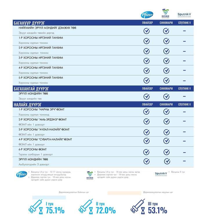 Өнөөдөр Улаанбаатар хотод суурин 156 цэгт 156 багийн 746 эмч, ажилтан ажиллана. Та өөрт ойр вакцины аль ч цэгт очиж дархлаажуулалтад хамрагдах боломжтой. Дархлаажуулалтын цэгүүд 09:00-17:30 цаг хүртэл ажиллана.