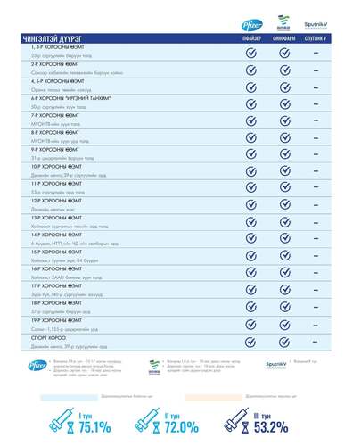 Өнөөдөр Улаанбаатар хотод суурин 156 цэгт 156 багийн 746 эмч, ажилтан ажиллана. Та өөрт ойр вакцины аль ч цэгт очиж дархлаажуулалтад хамрагдах боломжтой. Дархлаажуулалтын цэгүүд 09:00-17:30 цаг хүртэл ажиллана.