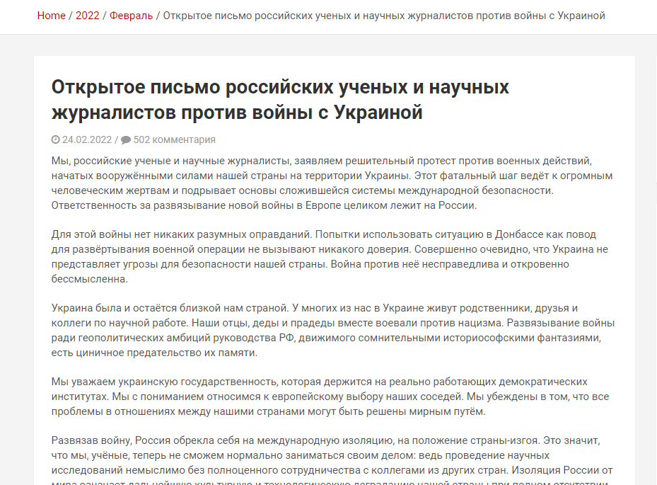 Дайныг нэн даруй зогсоож, Украины тусгаар тогтнол, нутаг дэвсгэрийн бүрэн бүтэн байдлыг хүндлэхийг шаардаж байгаагаа эрдэмтэд илэрхийлсэн байна. Энэхүү нээлттэй захидалд одоогийн байдлаар 320 гаруй эрдэмтэн, шинжлэх ухааны сэтгүүлч гарын үсэг зуржээ.