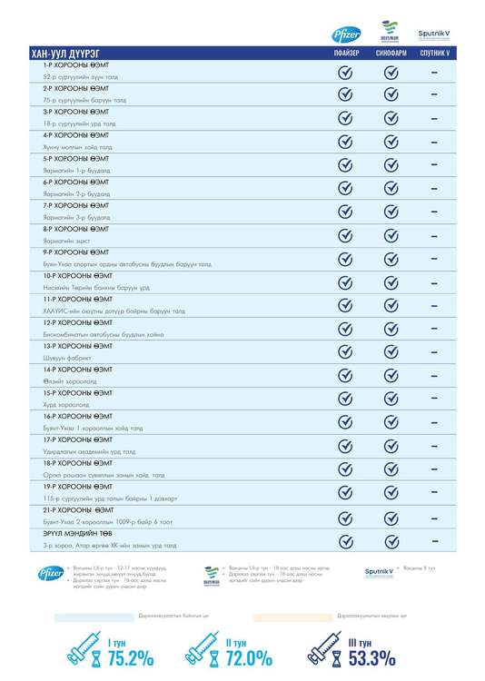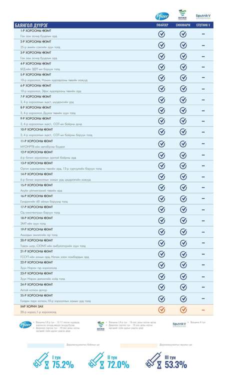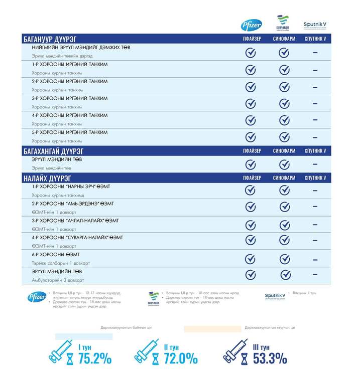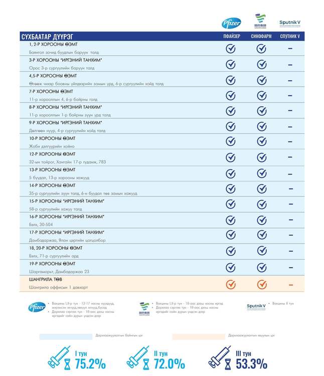 Өнөөдөр Улаанбаатар хотод түр 3, суурин 155 цэгт 158 багийн 753 эмч, ажилтан ажиллана. Та өөрт ойр вакцины аль ч цэгт очиж дархлаажуулалтад хамрагдах боломжтой. Дархлаажуулалтын цэгүүд 09:00-17:30 цаг хүртэл ажиллана.