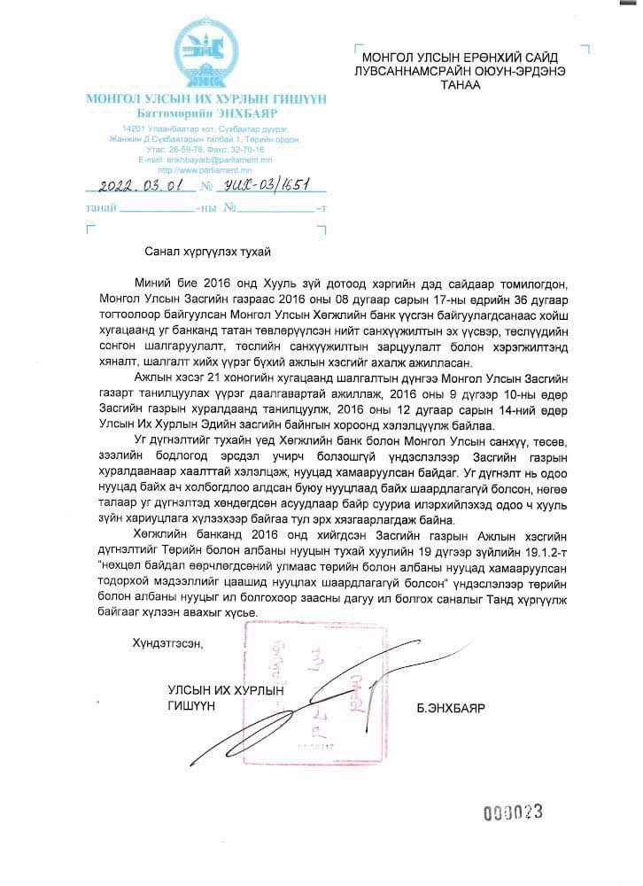 Харин одоо 2016 оны шалгалтын материалыг нууцлах шаардлагагүй болсон хэмээн УИХ-ын гишүүн Б.Энхбаяр үзэж, Ерөнхий сайдад хандлаа.