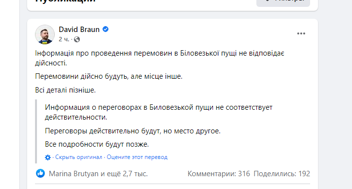 Шинэ хэлэлцээ Беловежийн төгөлд болно гэсэн мэдээлэл гарч байлаа. Харин Украины төлөөлөгчдийн гишүүн Давид Арахамия энэ мэдээллийг няцаасан байна. Хэлэлцээ болно, гэхдээ өөр газар болно хэмээн тэрбээр Фейсбүүк хуудсандаа бичжээ