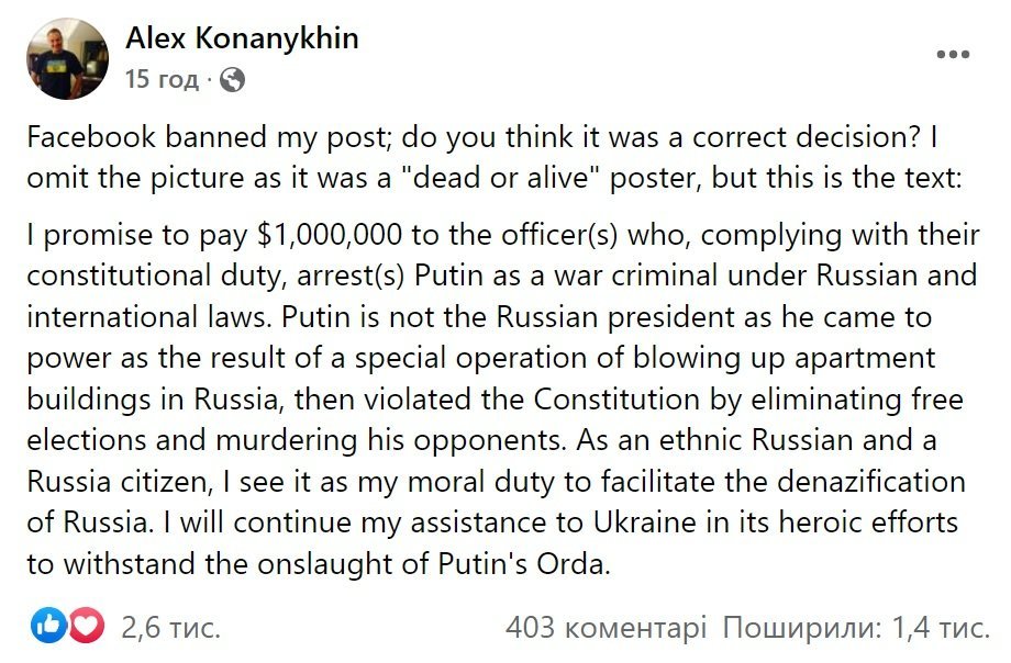 Бизнесмений энэ пост дээр анхандаа Путиний гэрэл зургийг оруулж "үй олноор хөнөөснийх нь төлөө Владимир Путинийг амьд болон үхснээр нь эрэн сурвалжилж байна" хэмээн бичиж, Путиний толгойг үнэлсэн байжээ. Харин Фейсбүүк энэ зургийг ёс суртахуунгүй гэж үзсэн тул бизнесмен устгасан байна.