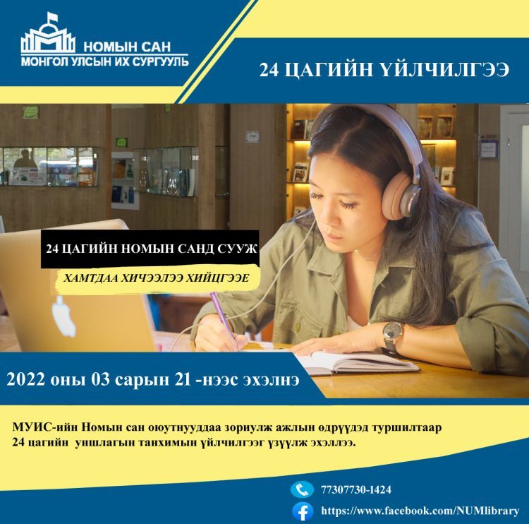МУИС-ийн Номын сан нь шалгалтын үеэр 24 цагаар үйлчилгээ үзүүлдэг байсан бол 2022 оны 3 дугаар сарын 21-ний өдрөөс эхлэн ажлын өдрүүдэд 24 цагийн уншлагын танхимыг туршилтаар нээж ажиллуулахаар боллоо.