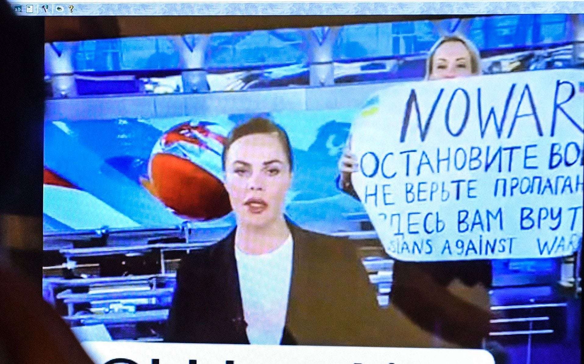 Тодруулбал, мэдээллийн хөтөлбөрийн хөтлөгч Екатерина Андреева мэдээ хүргэж байх үеэро түүний ард нэгэн эмэгтэй гарч ирэн, “Дайныг зогсоо, суртал ухуулгад битгий итгэ, та нарт худлаа ярьж байна” гэсэн бичиг барин зогссон байна. Тус телевиз болсон хэргийг шалган, улмаар энэ эмэгтэйд хариуцлага тооцохоор болсон талаар ТАСС агентлаг мэдээлжээ.