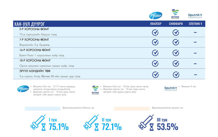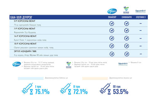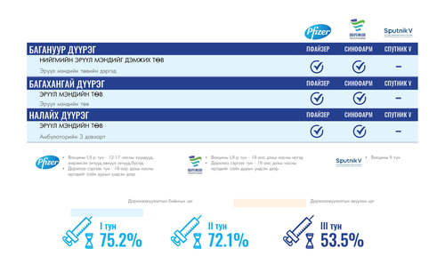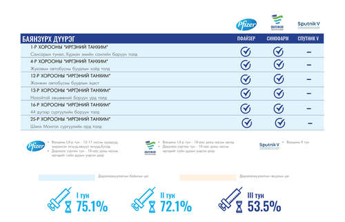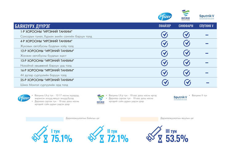 Өнөөдөр Улаанбаатар хотод суурин 35 цэгт 35 багийн 142 эмч, ажилтан ажиллана. Та өөрт ойр вакцины аль ч цэгт очиж дархлаажуулалтад хамрагдах боломжтой. Дархлаажуулалтын цэгүүд 09:00-17:30 цаг хүртэл ажиллана.