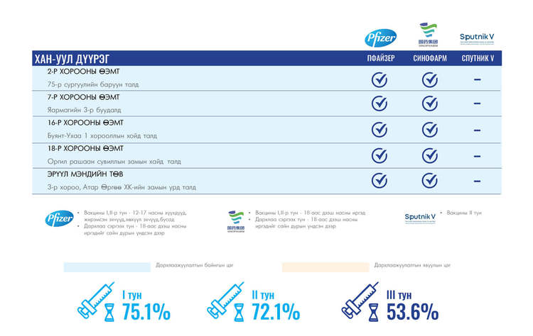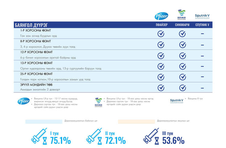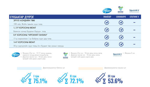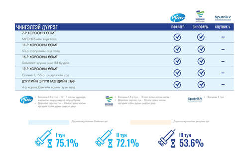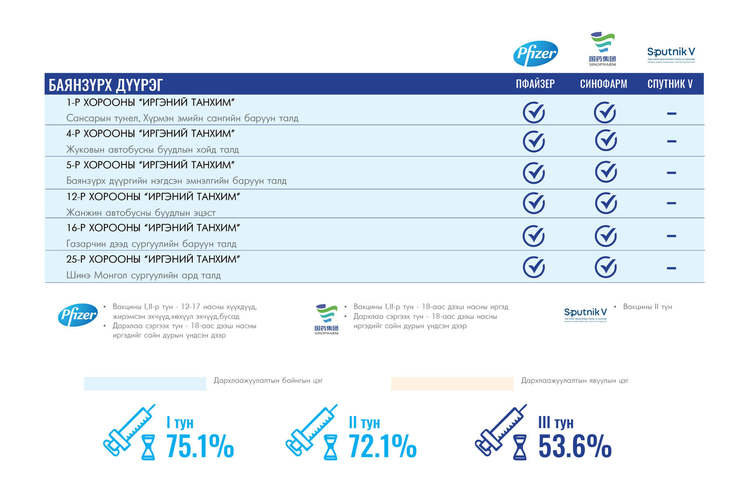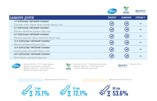 Өнөөдөр Улаанбаатар хотод суурин 35 цэгт 35 багийн 142 эмч, ажилтан ажиллана. Та өөрт ойр вакцины аль ч цэгт очиж дархлаажуулалтад хамрагдах боломжтой. Дархлаажуулалтын цэгүүд 09:00-17:00 цаг хүртэл ажиллана.