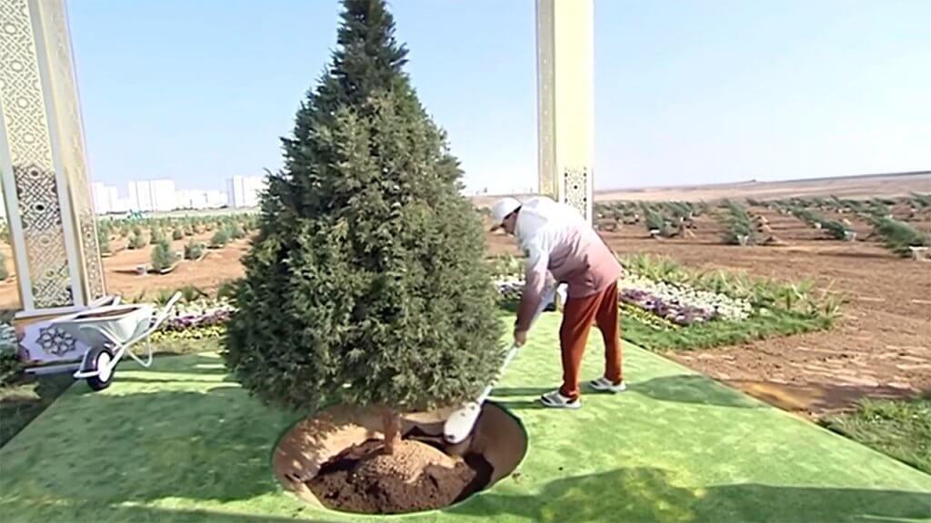 Тэрбээр субботникт оролцохдоо тусгайлан хивс дэвссэн асар дор мод суулгасан байна. Харин бусад оролцогчид, тэр дундаа өмнөх ерөнхийлөгч Гурбангулы Бердымухамедов талбайд мод тарьсан гэнэ.