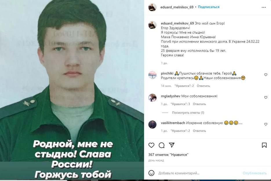 Амь үрэгдсэн цэргийн аав Эдуард Мельников Инстаграм хуудсандаа хүүгийнхээ үхлийн талаар бичихдээ "Энэ бол миний хүү Егор! Егор Эдуардович! Би түүнээр бахархаж байна! Би огт ичихгүй байна. Цэргийн үүргээ гүйцэтгэж яваад амь үрэгдсэн. Хоёрдугаар сарын 25-нд тэр 19 хүрэх байлаа. Баатрууд мандтугай!" гэсэн пост бичжээ. Одоо энэ постыг устгасан ч Оросын Регнум агентлаг скриншот хийж амжсан байна.