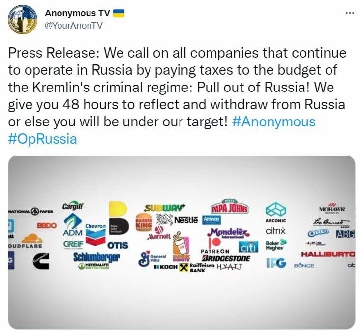 Харин ийнхүү Орост үлдсэн гадаадын компаниудыг олон улсын хакерчдын бүлэг болох Anonymous сүрдүүлжээ. Тэд ийм компаниудыг 48 цагийн дотор үйл ажиллагаагаа зогсоохгүй бол цахим халдлага үйлдэнэ хэмээсэн байна.