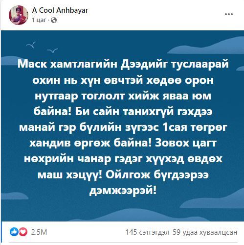 Тэгвэл дуучин A COOL Буюу Б.Анхбаяр нь Д.Дэлгэрсайханы охины эмчилгээний зардалд 1 сая төгрөг хандивлажээ. Энэ тухайгаа тэрбээр өөрийн цахим хуудаснаа "Маск хамтлагийн Дээгийд туслаарай. Охин нь хүн өвчтэй хөдөө орон нутгаар тоглолт хийж яваа юм байна. Би сайн танихгүй. Гэхдээ манай гэр бүлийн зүгээс 1 сая төгрөг хандив өргөж байна. Зовох цагт нөхрийн чанар гэдэг хүүхэд өвдөх маш хэцүү. Ойлгож бүгдээрээ дэмжээрэй. гэж бичжээ