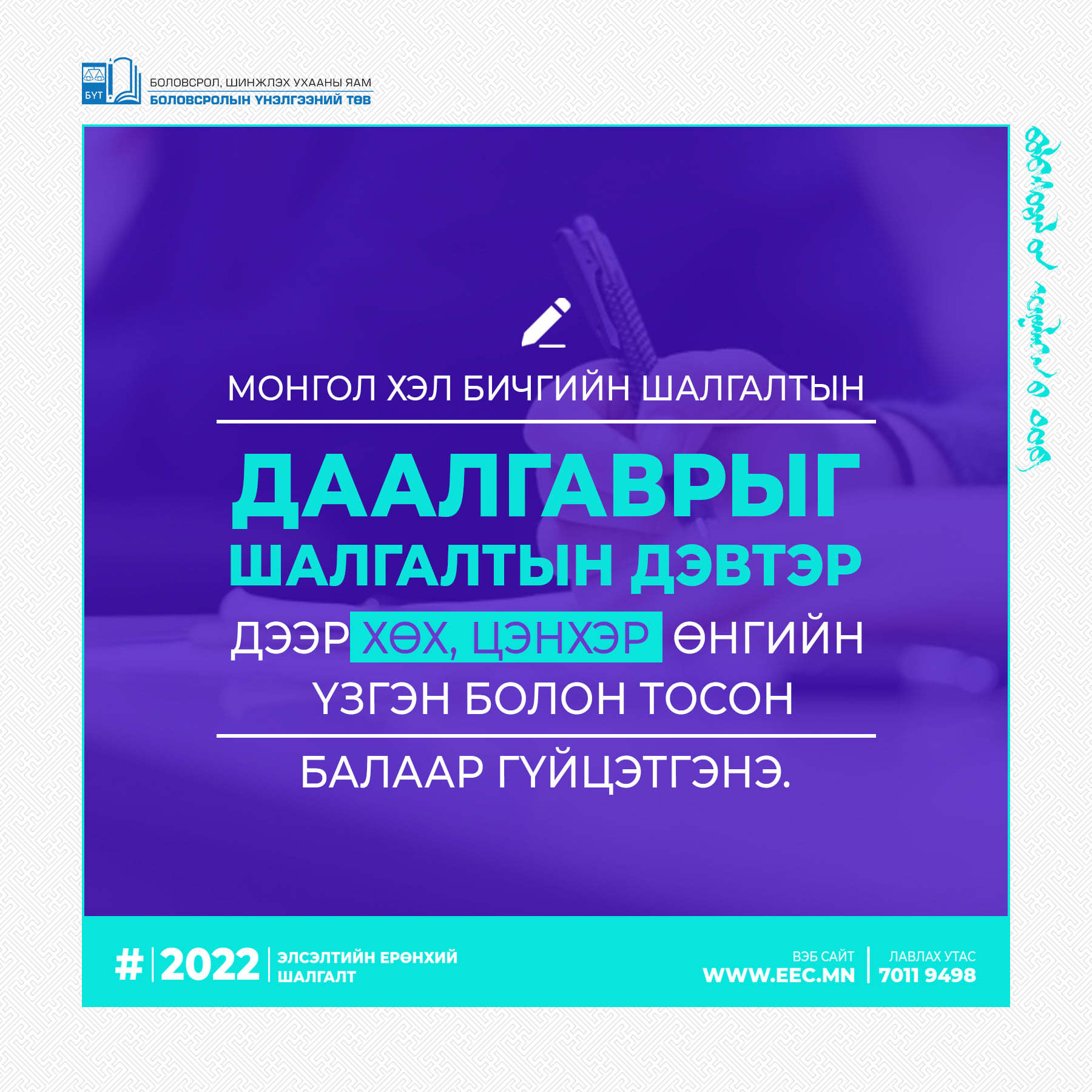 Монгол хэл бичгийн шалгалтыг Улаанбаатар хотын цагаар 2022 оны 04 сарын 02-ны өдөр зохион байгуулна. Монгол хэл бичгийн шалгалтын босго оноо 400 байна.