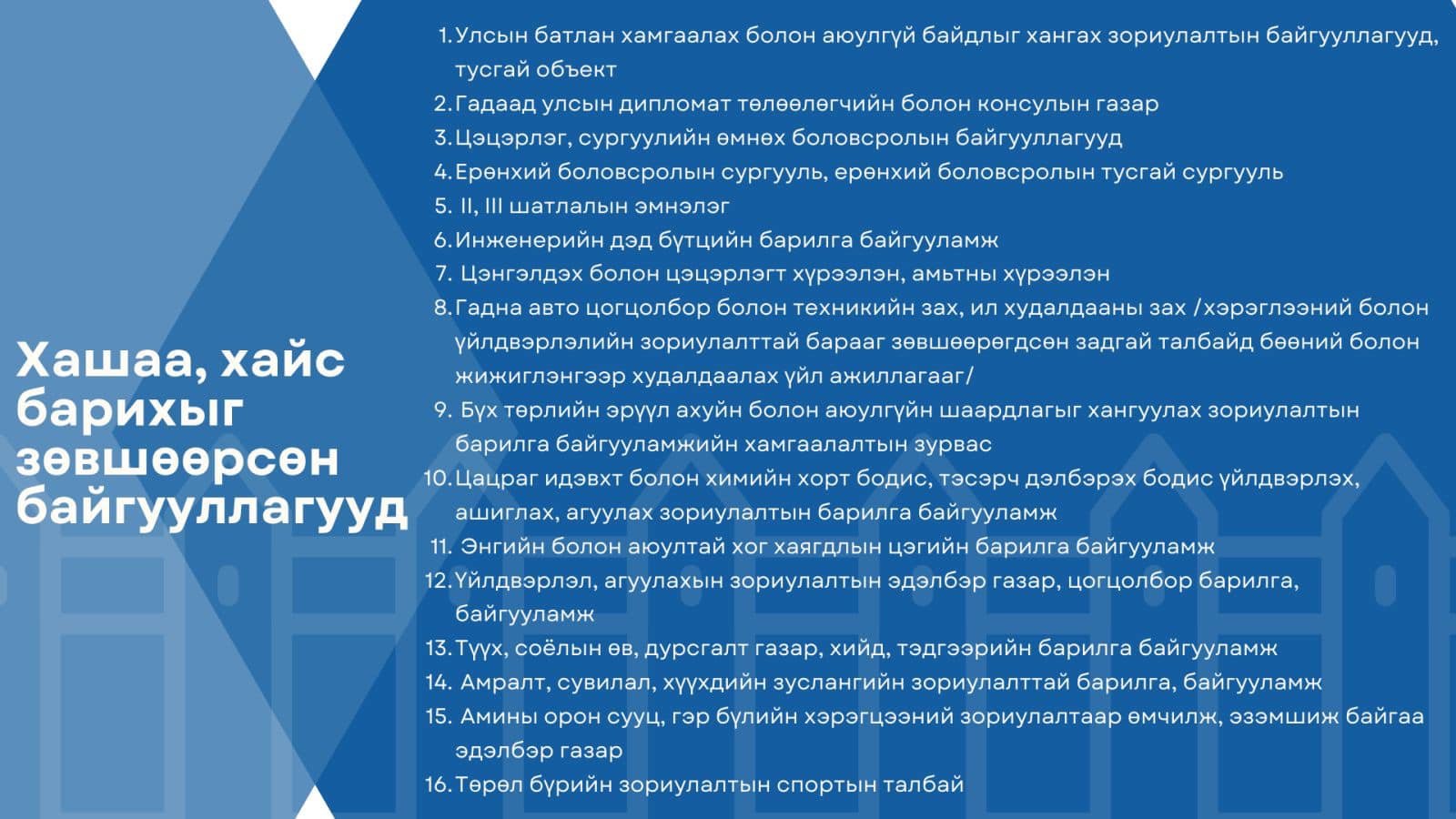 Нийслэлд дараах 16 чиглэлийн байгууллагыг хайс, хашаатай байхыг зөвшөөрдөг байна. Харин бусад нь барилга, байгууламжийнхаа гадуур хайс, хашаа барьсан бол хууль бус хэмээн үзэх аж.