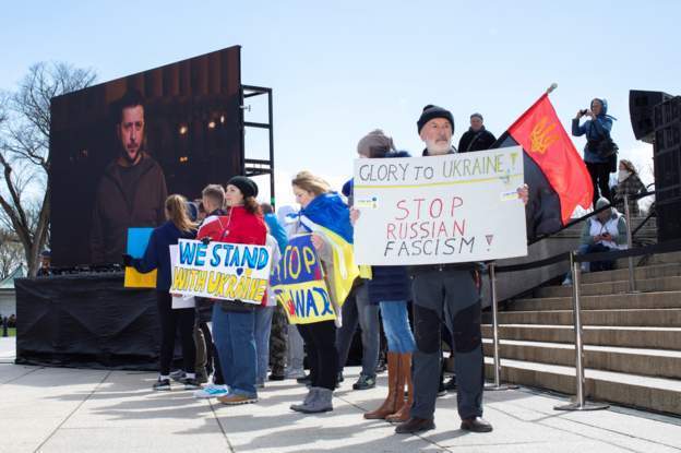 АНУ-ын нийслэл Вашингтон хотод ч Украиныг дэмжсэн жагсаал болсон байна. Оролцогчид гартаа "Дайныг зогсоо", "Бид Украинтай хамт", "Оросын фашизмыг зогсоо" гэсэн хуудас барьжээ.