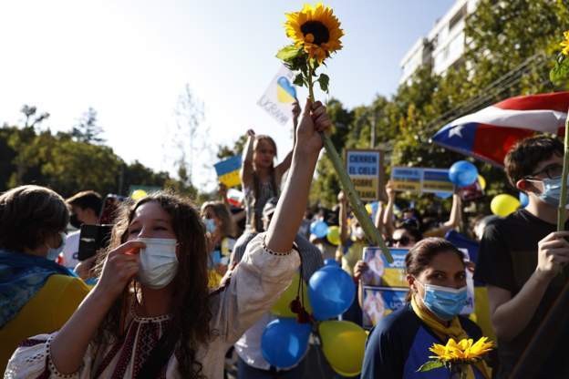 Чилийн нийслэл Сантьяго хотод ч дайн эсэргүүцэж, Украиныг дэмжсэн жагсаал болсон байна. Жагсаалд оролцогчид Украины төрийн далбааны өнгө болох цэнхэр, шар өнгийн бөмбөлгүүд, мөн өнгийн хувцас өмссөний дээр Украины бэлгэдлүүдийн нэг болох наранцэцэг барьжээ.