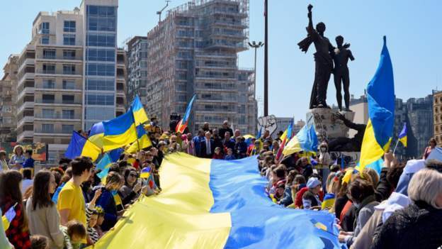Ливаны нийслэл Бейрут хотын оршин суугчид жагсаалынхаа үеэр Украины далбаа барьжээ.