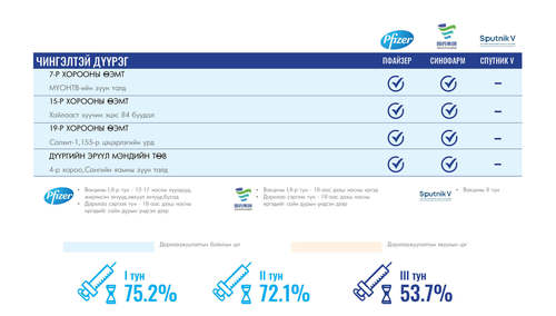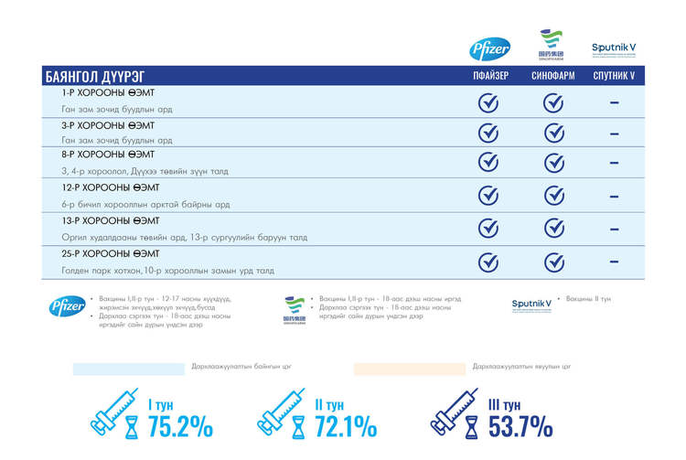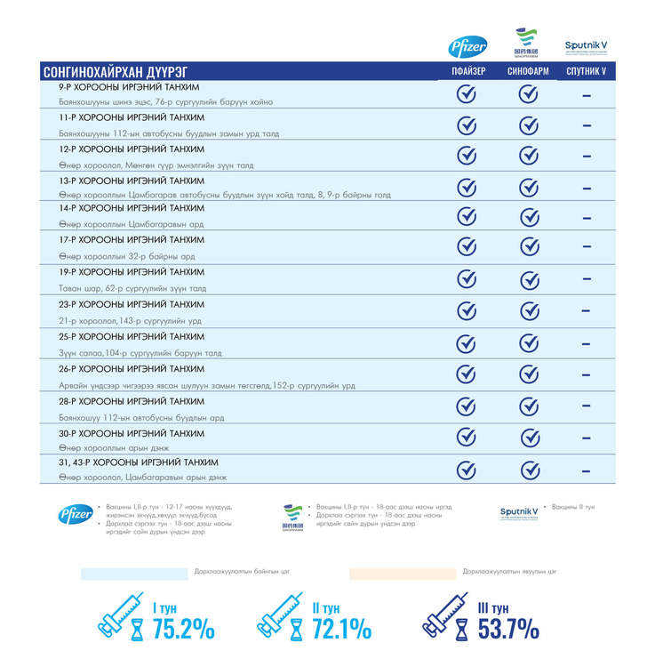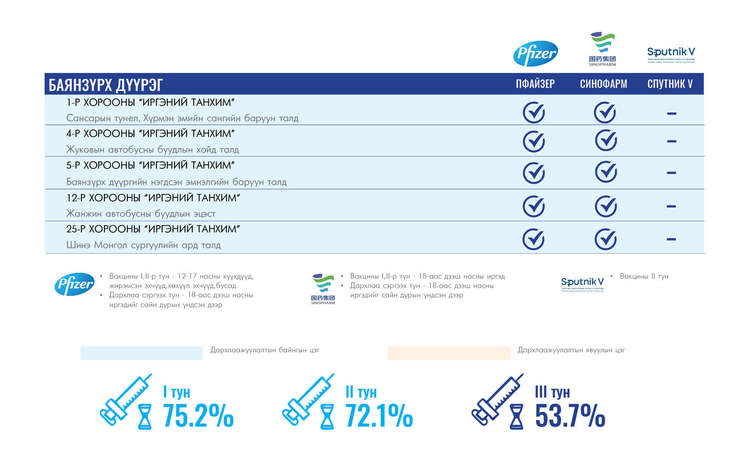 Өнөөдөр Улаанбаатар хотод суурин 48 цэгт 48 багийн 194 эмч, ажилтан ажиллана. Та өөрт ойр вакцины аль ч цэгт очиж дархлаажуулалтад хамрагдах боломжтой. Дархлаажуулалтын цэгүүд 09:00-16:00 цаг хүртэл ажиллана.