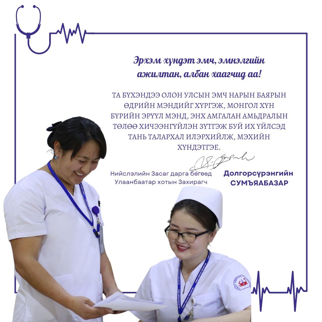 Та бүхэндээ олон улсын эмч нарын баярын мэндийг хүргэж, монгол хүн бүрийн амь нас, эрүүл мэнд, гэр бүл, энх амгалан амьдралын төлөөх эрхэм үйлсэд тань талархал илэрхийлж, хүндэтгэн мэхийе.