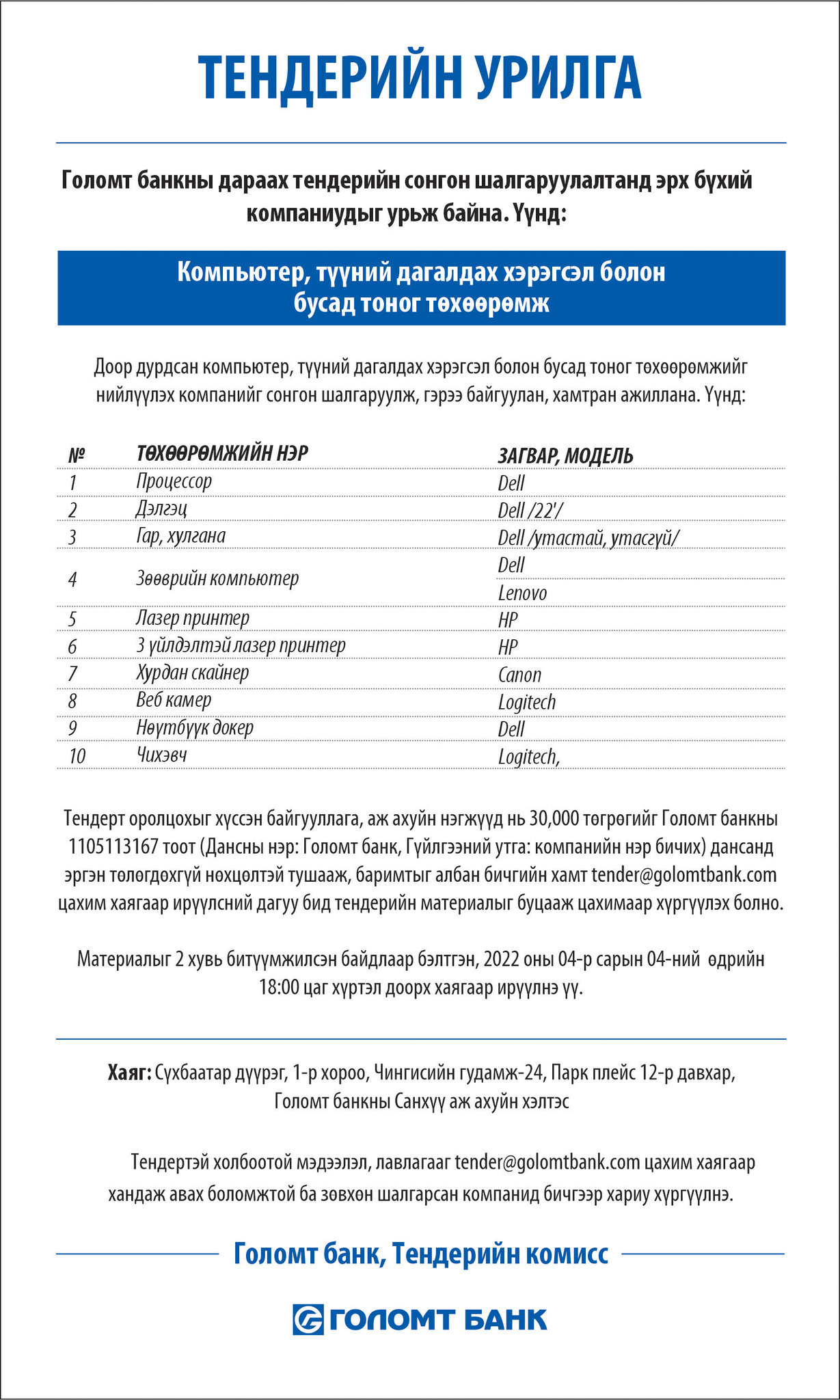 Тендерийн урилга