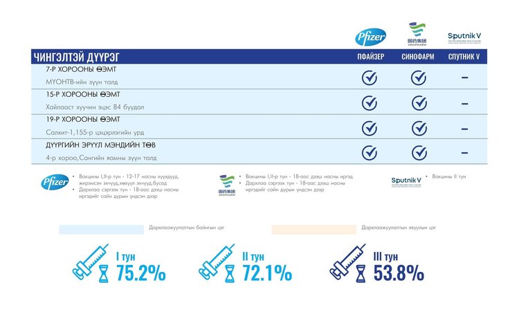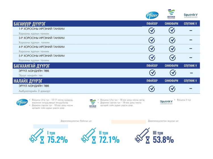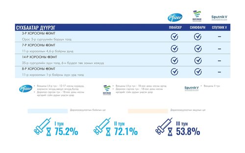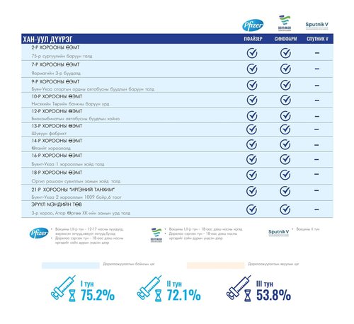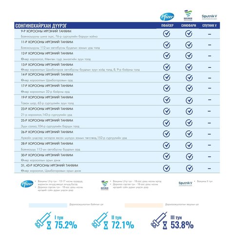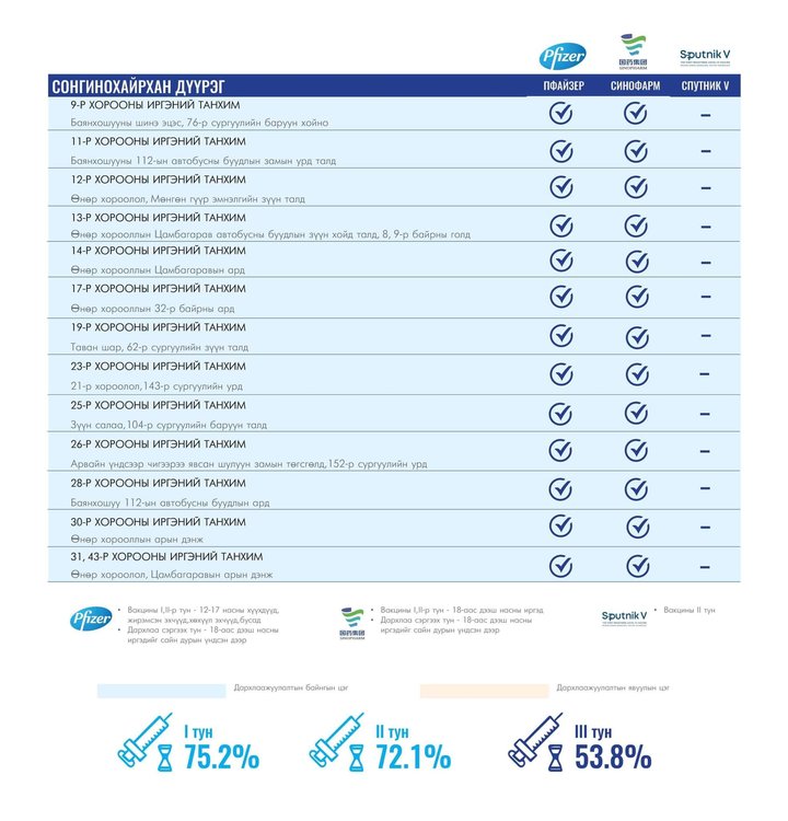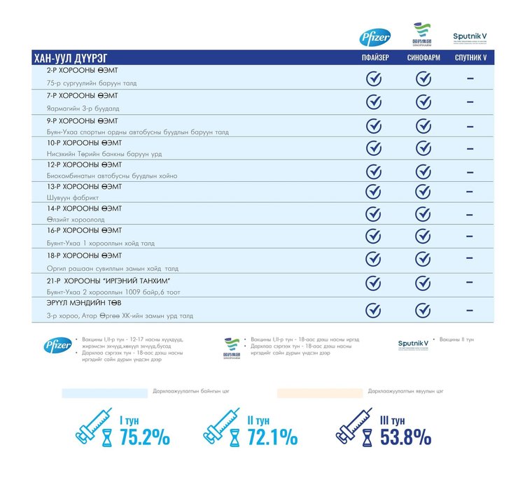Өнөөдөр Улаанбаатар хотод суурин 49 цэгт 49 багийн 197 эмч, ажилтан ажиллана. Та өөрт ойр вакцины аль ч цэгт очиж дархлаажуулалтад хамрагдах боломжтой. Дархлаажуулалтын цэгүүд 09:00 - 16:00 цаг хүртэл ажиллана.