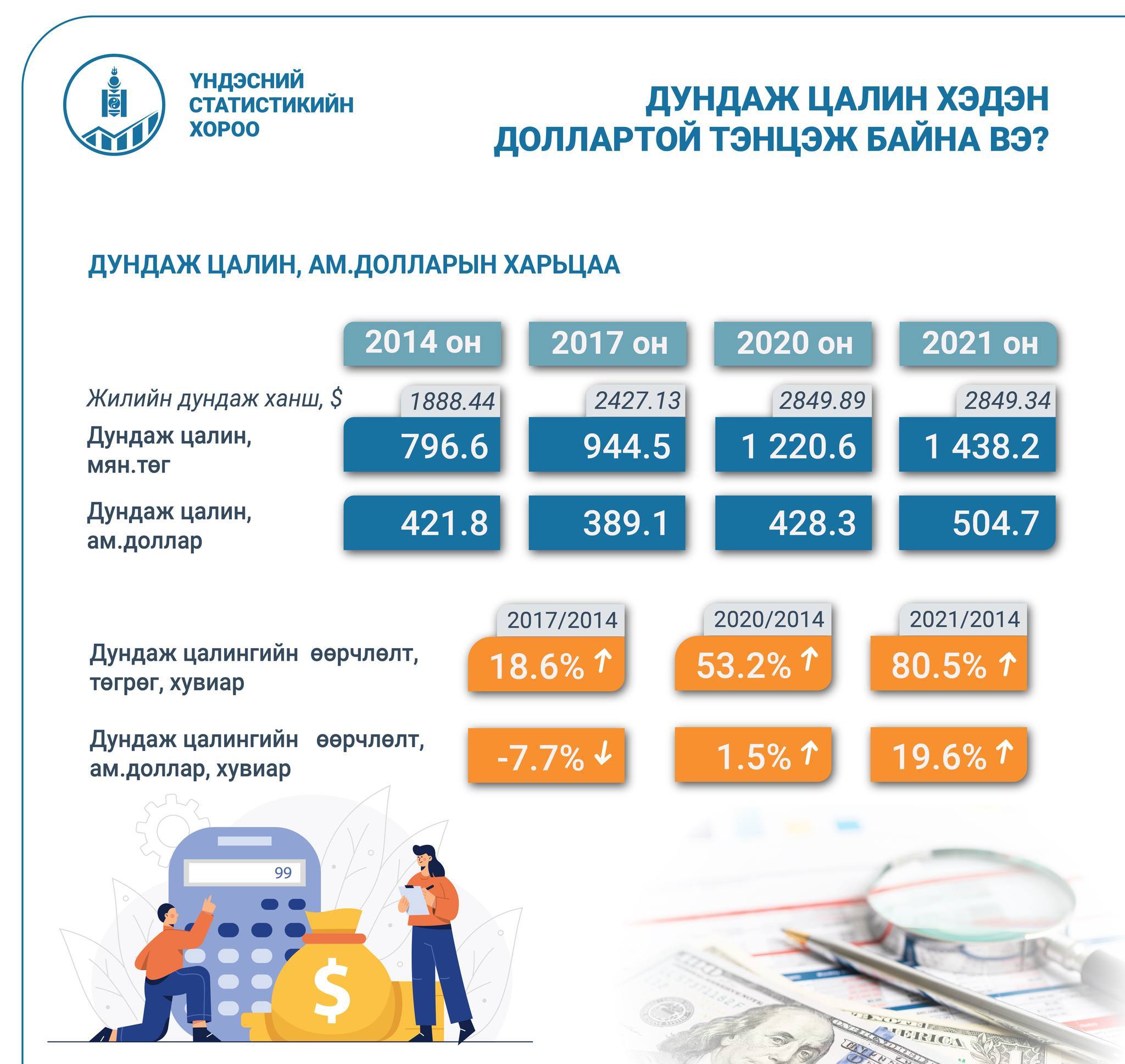 Дундаж цалингийн хэмжээ 2021 онд 1.4 сая төгрөгт хүрсэн нь 504.7 ам.доллартай тэнцэж байна. Дундаж цалингийн өөрчлөлтийг 2014 онтой харьцуулахад 642.0 мянган төгрөгөөр өссөн бол доллараар авч үзвэл ердөө 83 ам.доллараар өсжээ.