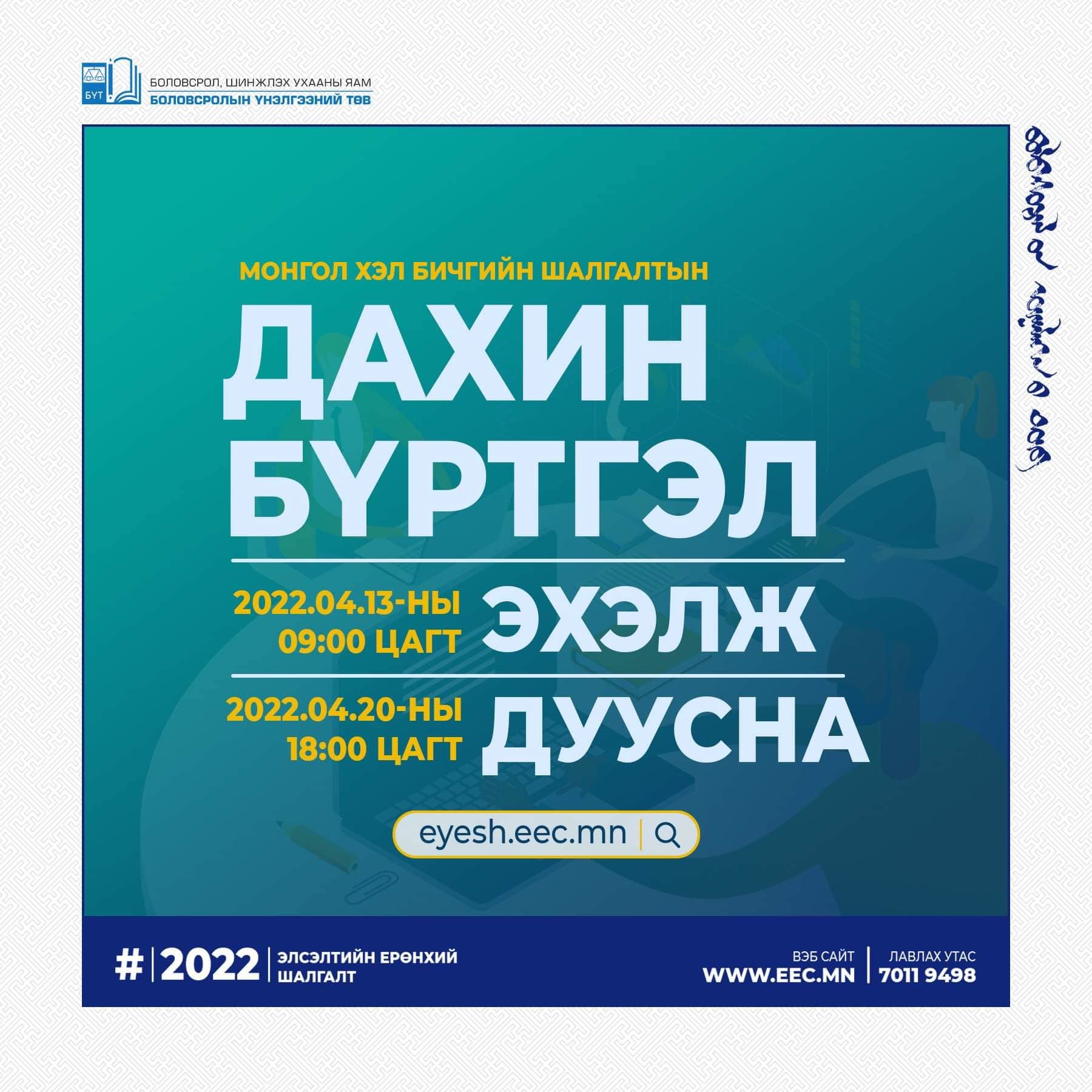 Монгол хэл, бичгийн дахин шалгалтын бүртгэл эхэллээ. Тодруулбал, Энэ жил Монгол хэл, бичгийн шалгалтыг хоёр удаа зохион байгуулахаар шийдвэрлэсэн. 2022 оны ЭЕШ-ын журмын 1 дүгээр зүйлийн 1.5, 1.6 дахь заалтыг үндэслэн 2022.04.02-ны өдрийн шалгалтад хамрагдаж чадаагүй болон босго онооны болзол хангаагүй шалгуулагчид дахин бүртгэлд хамрагдах боломжтой.