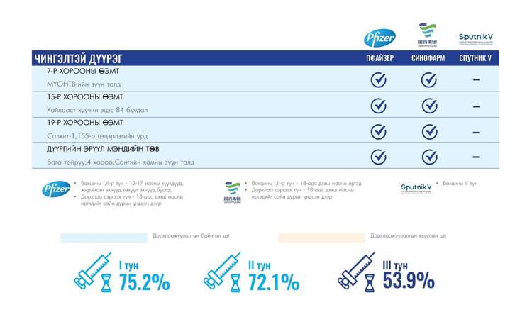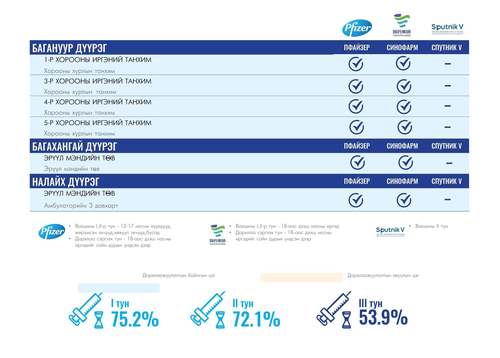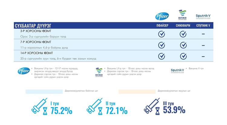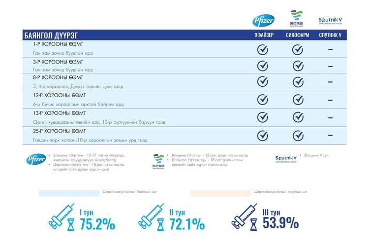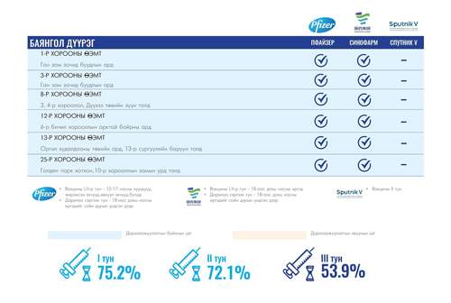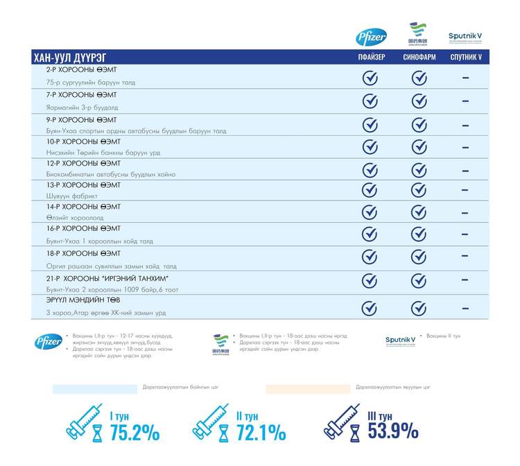 Өнөөдөр Улаанбаатар хотод суурин 48 цэгт 48 багийн 194 эмч, ажилтан ажиллана. Та өөрт ойр вакцины аль ч цэгт очиж дархлаажуулалтад хамрагдах боломжтой. Дархлаажуулалтын цэгүүд 09:00-16:00 цаг хүртэл ажиллана.