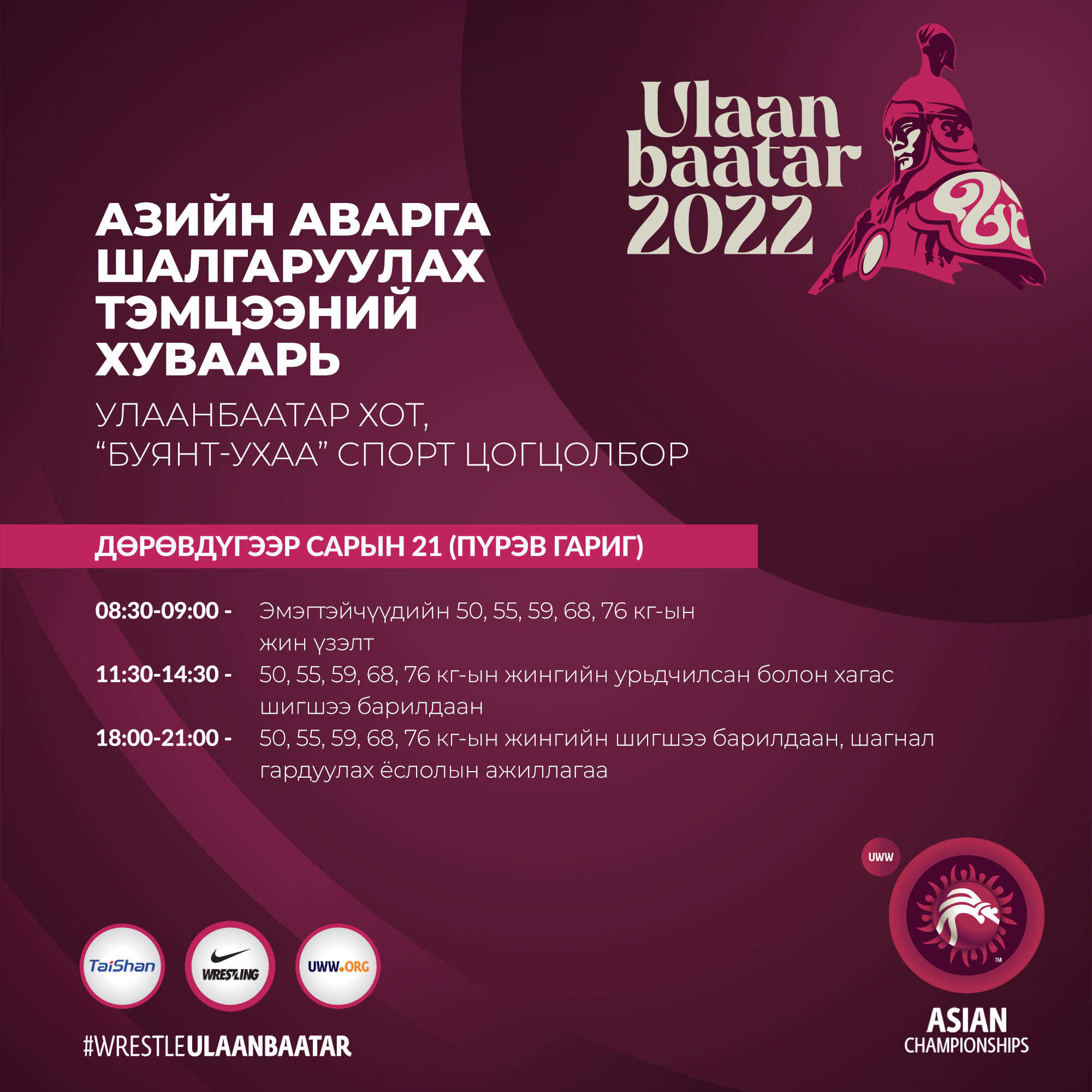 "Улаанбаатар-2022" Азийн АШТ-ий чөлөөт бөхийн төрөл өнөөдөр эмэгтэйчүүдийн 50, 55, 59, 68, 76 кг-ын жингийн барилдаанаар эхэлнэ. Өнөөдрийн тэмцээний хуваарьтай танилцана уу.