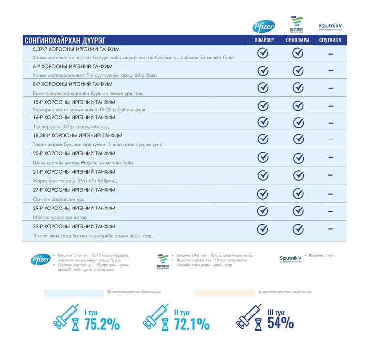 Өнөөдөр Улаанбаатар хотод суурин 48 цэгт 48 багийн 194 эмч, ажилтан ажиллана. Та өөрт ойр вакцины аль ч цэгт очиж дархлаажуулалтад хамрагдах боломжтой. Дархлаажуулалтын цэгүүд 09:00-16:00 цаг хүртэл ажиллана.