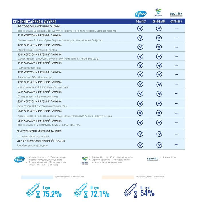 Өнөөдөр Улаанбаатар хотод суурин 49 цэгт 49 багийн 186 эмч, ажилтан ажиллана. Та өөрт ойр вакцины аль ч цэгт очиж дархлаажуулалтад хамрагдах боломжтой. Дархлаажуулалтын цэгүүд 09:00-16:00 цаг хүртэл ажиллана.