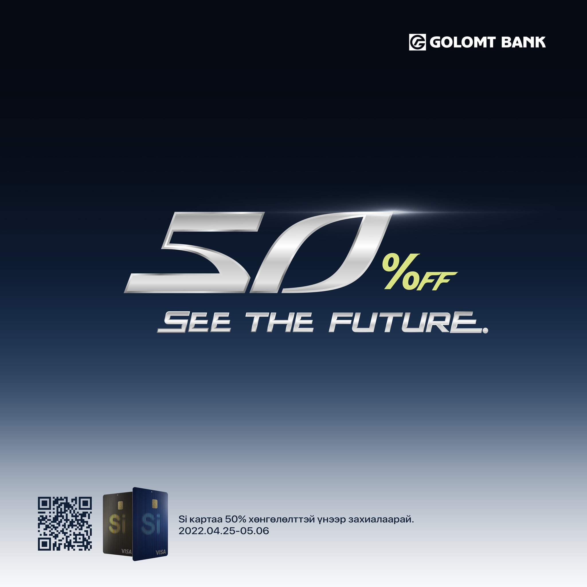Тиймээс Голомт банк 2022.04.25-05.06-ний хооронд Si картын шинэ харилцагчдад зориулсан хөнгөлөлттэй урамшууллыг зарлаж байна. Энэ хугацаанд Si Кредит картыг шинээр захиалсан тохиолдолд жилийн хураамжаас, Si Дебит картыг шинээр захиалсан тохиолдолд элсэлтийн хураамжаас тус тус 50% хөнгөлөх болно.