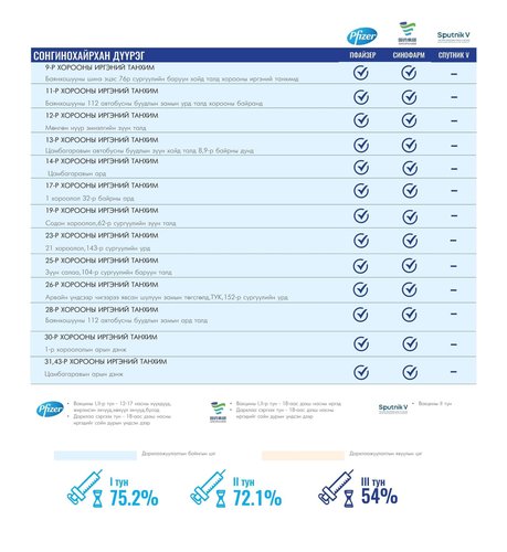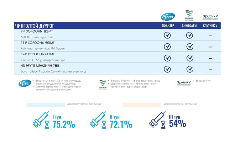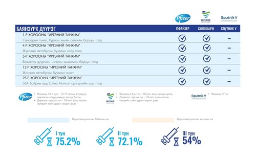 Өчигдөр нийслэлийн хэмжээнд I тунд 5, II тунд 15, III тунд 85, IV тунд 62, нийт 167 иргэнийг дархлаажууллаа.Вакцинжуулалт эхэлснээс хойш нийслэлийн зорилтот хүн амын I тунгийн хамралт 75.2 хувь, II тунгийн хамралт 72.1 хувь, III тунгийн хамралт 54 хувь, нэмэлт IV тунгийн хамрагдалт 6.8 хувь байна.
