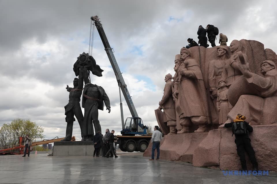 Киевийн Ард түмнүүдийн найрамдлын арк дор байрлаж байсан энэ хөшөө Ард түмнүүдийн найрамдлын одон бүхий туузыг барьсан Орос, Украины хоёр ажилчныг дүрсэлсэн байсан юм. Ийнхүү энэ хөшөөг буулгасан бол аркийн нэрийг ч өөрчлөн, Украины далбаан өнгөөр будахаар болсон гэнэ.