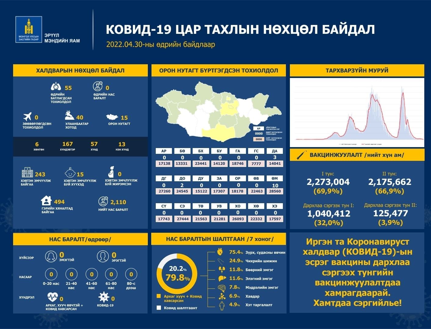 Эрүүл мэндийн яамнаас коронавирусийн халдварын 2022 оны 04 дүгээр сарын 30-ны өдрийн тоон мэдээллийг гаргалаа. Сүүлийн 24 цагийн хугацаанд улсын хэмжээнд 55 халдвар шинжилгээгээр батлагдлаа. Үүний 40 нь Улаанбаатарт, 15 нь орон нутагт бүртгэгдсэн байна. Харин нас баралт бүртгэгдээгүй байна.