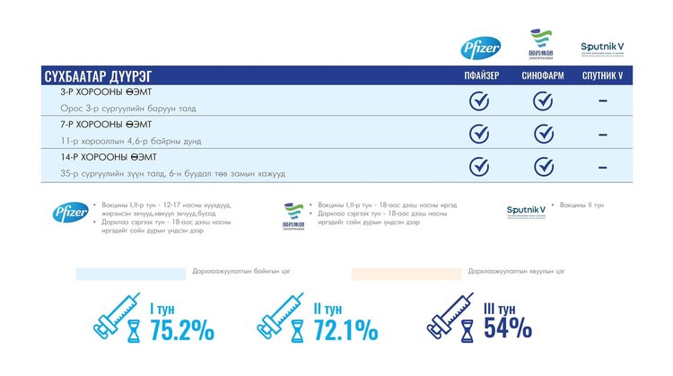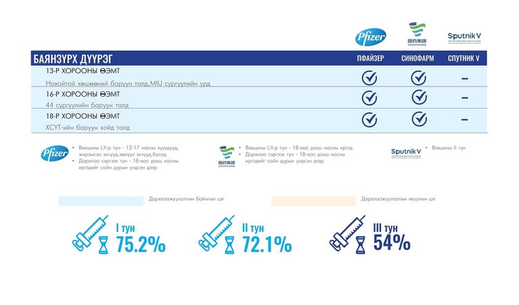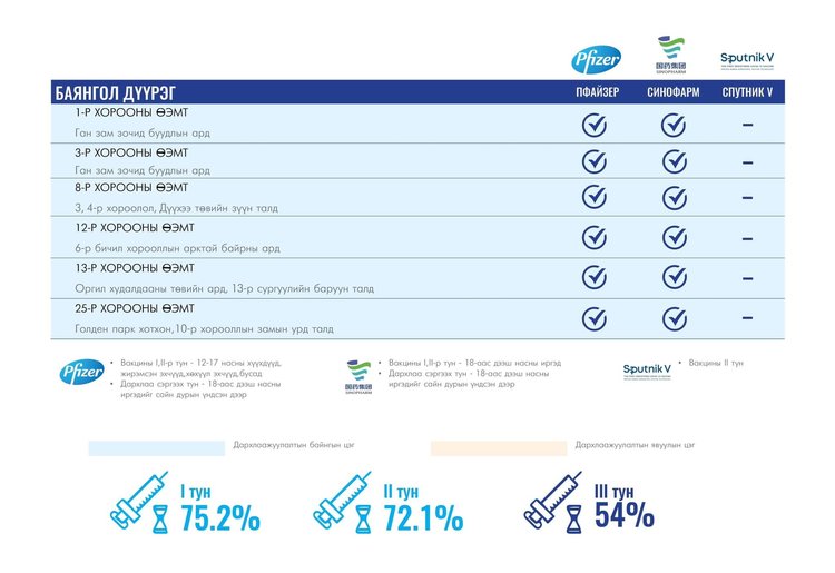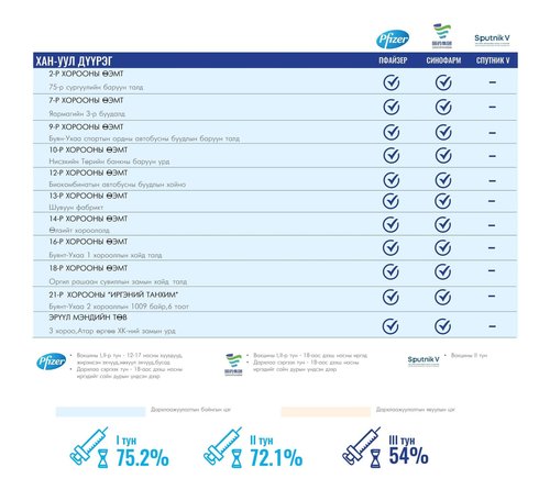 Өнөөдөр Улаанбаатар хотод суурин 46 цэгт 46 багийн 173 эмч, ажилтан ажиллана. Та өөрт ойр вакцины аль ч цэгт очиж дархлаажуулалтад хамрагдах боломжтой. Дархлаажуулалтын цэгүүд 09:00-16:00 цаг хүртэл ажиллана.