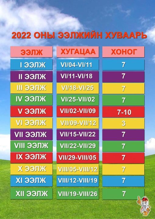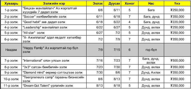 Тус зуслангийн нэгдүгээр ээлж 6 сарын 3-ны өдөр эхлэх бөгөөд нэгдүгээр ээлжийн бүртгэл хэдийнээ хаагджээ. Харин бусад ээлжийн бүртгэл хэвийн явагдаж байна.