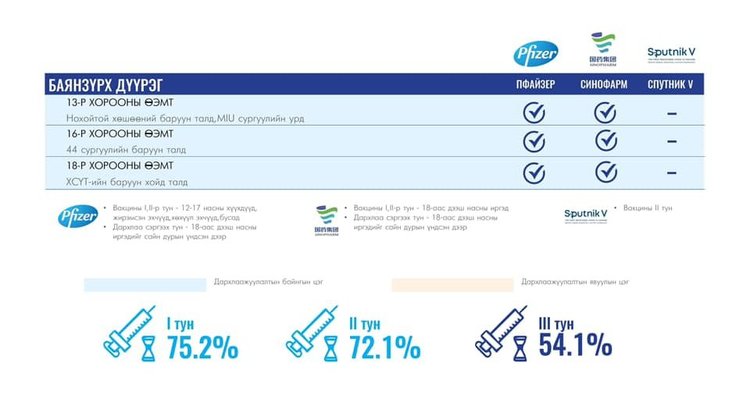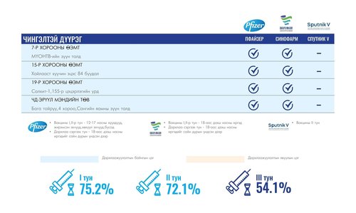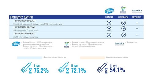 Өнөөдөр Улаанбаатар хотод суурин 39 цэгт 39 багийн 141 эмч, ажилтан ажиллана. Та өөрт ойр вакцины аль ч цэгт очиж дархлаажуулалтад хамрагдах боломжтой. Дархлаажуулалтын цэгүүд 09:00-16:00 цаг хүртэл ажиллана.