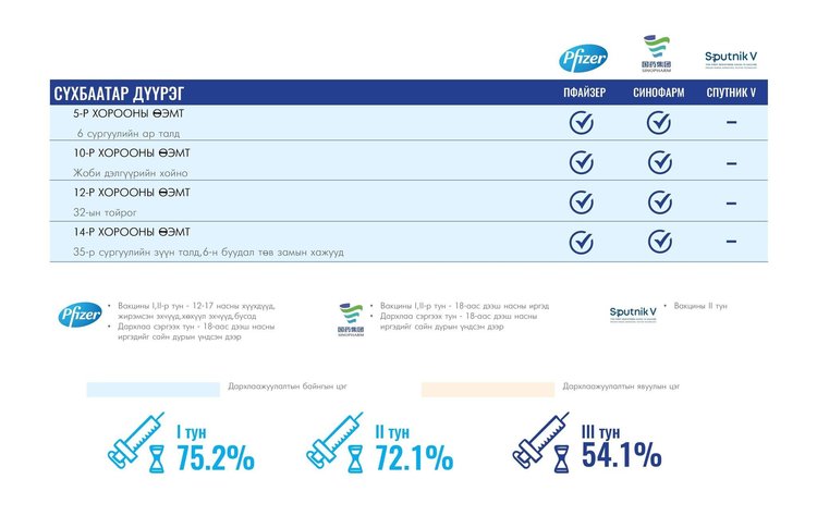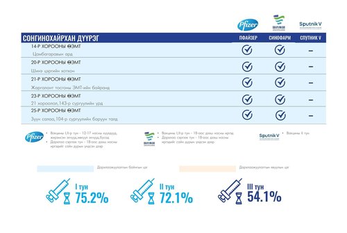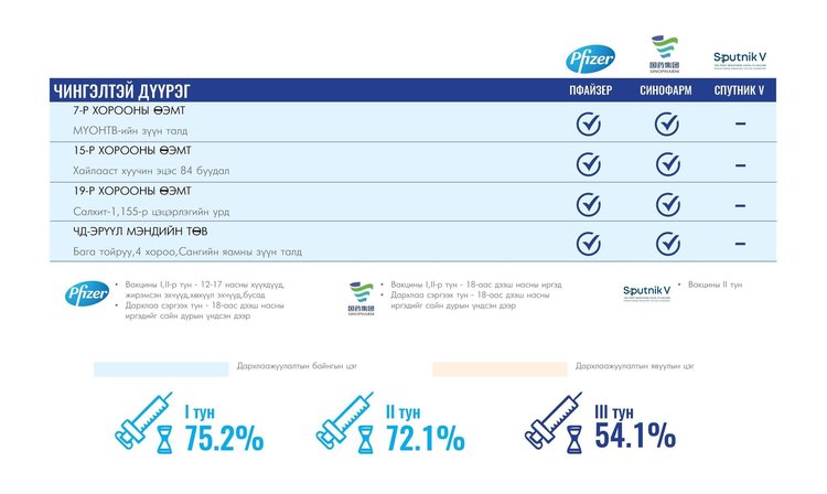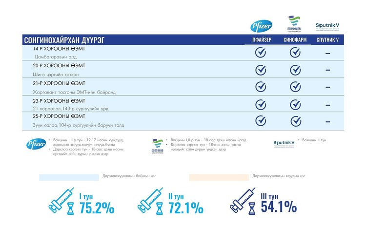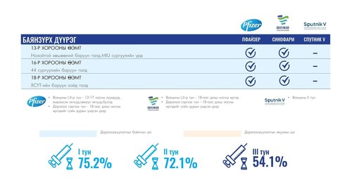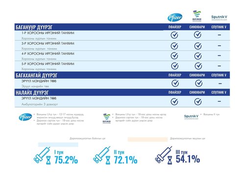 Өнөөдөр Улаанбаатар хотод суурин 39 цэгт 39 багийн 141 эмч, ажилтан ажиллана. Та өөрт ойр вакцины аль ч цэгт очиж дархлаажуулалтад хамрагдах боломжтой. Дархлаажуулалтын цэгүүд 09:00-16:00 цаг хүртэл ажиллана.
