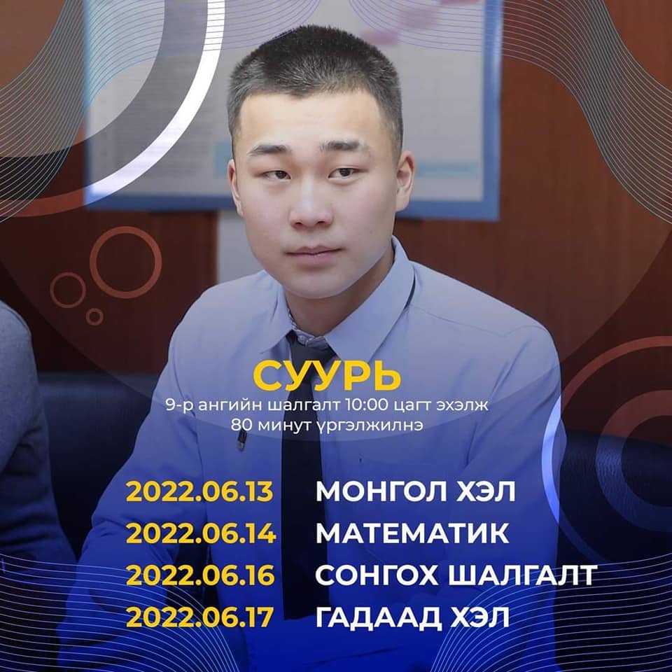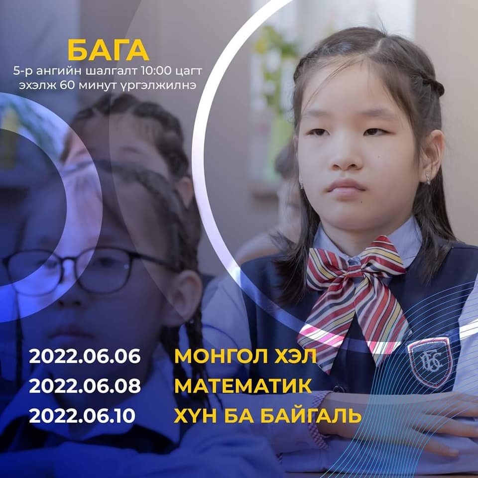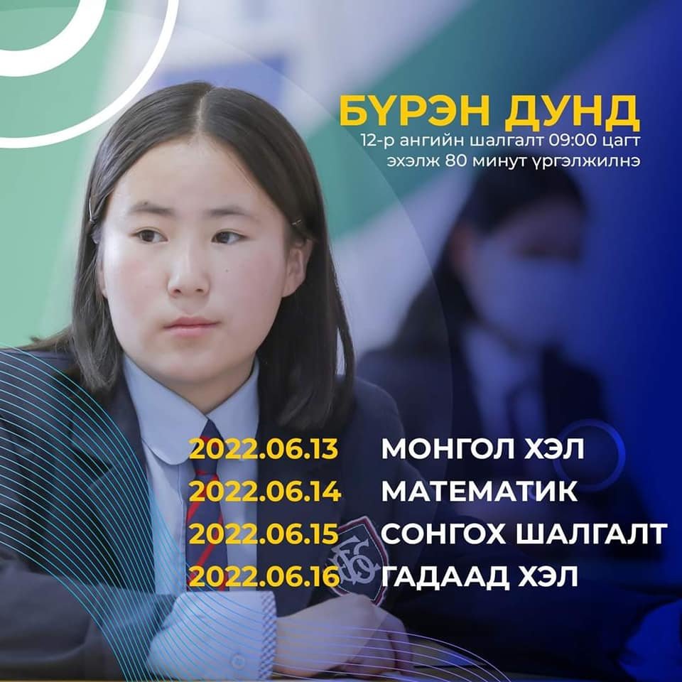 БСШУС-ын сайдын 2018 оны 06 дугаар сарын 29-ний өдрийн А/425 дугаар тушаалаар батлагдсан “Ерөнхий боловсролын сургуулийн суралцагчдын болон сургалтын чанарын үнэлгээний журам”-ын 5.4 дүгээр заалт, БШУ-ны сайдын 2022 оны А/38 дугаар тушаалаар баталсан “Ерөнхий боловсролын сургуулийн 2021-2022 оны хичээлийн II, III улирлын хичээл эхлэх, үргэлжлэх, дуусах хугацаа”-нд үндэслэн "УЛСЫН ШАЛГАЛТ"-ын товыг тогтоон зарлаж байна.