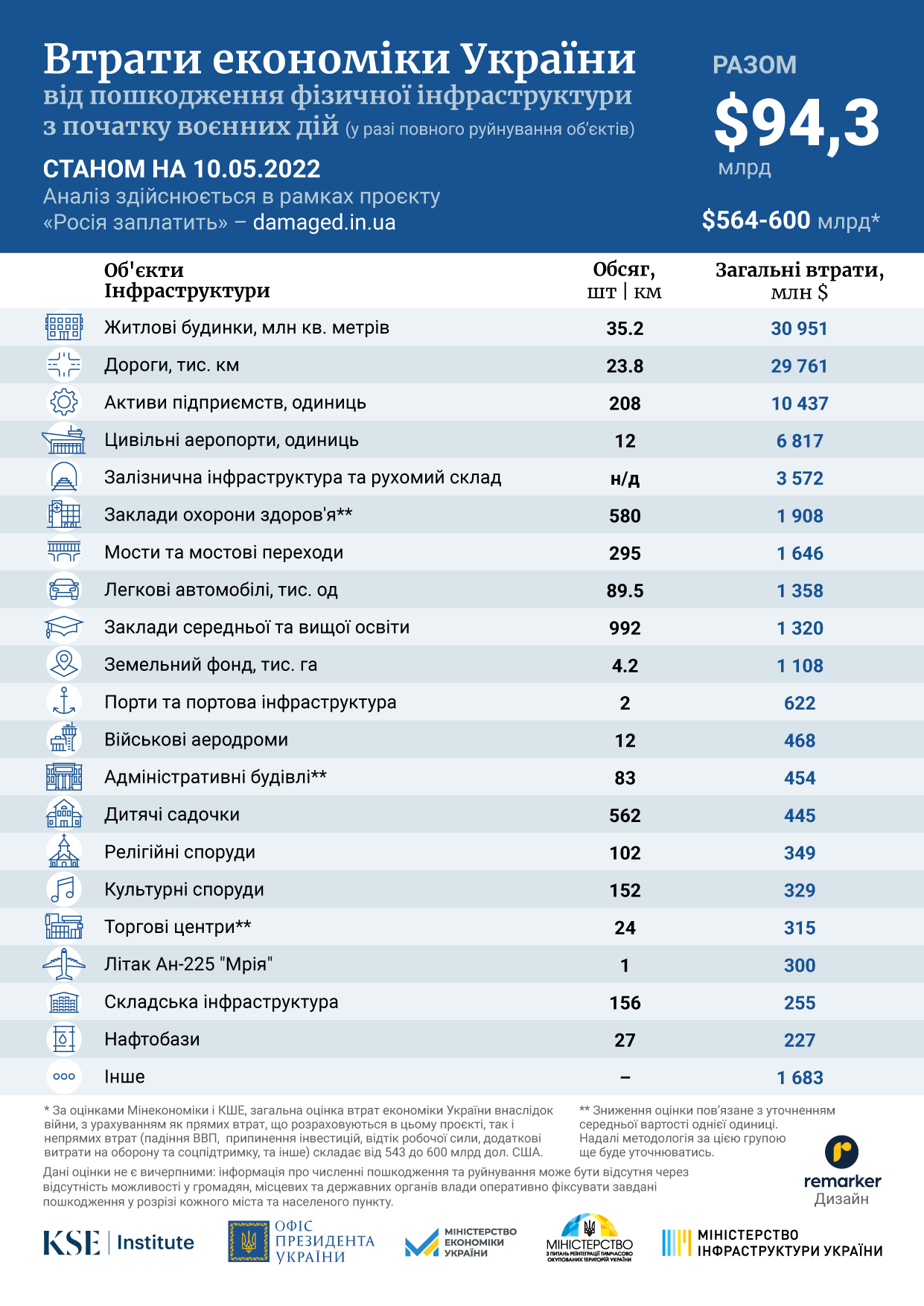 Тавдугаар сарын 10-ны өдрийн байдлаар Украины 27 газрын тосны бааз эвдэрч, сүйдсэний улмаас 227 сая долларын хохирол учирсан гэж "Орос төлнө" төслийнхөн тооцоолсон байна. Одоогоор баримтаар нотлогдсон, дэд бүтцийн хохирлын нийт хэмжээ 94 тэрбум долларыг даваад байгаа аж.