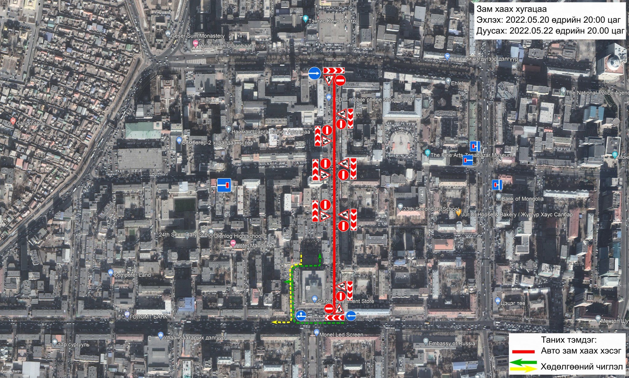 Нийслэлийн авто зам засвар, арчлалтын ажил үргэлжилж байна. Ирэх баасан гариг буюу 2022 оны тавдугаар сарын 20-ны 20.00 цагаас 2022 оны тавдугаар сарын 22-ны 20.00 цаг хүртэл Их дэлгүүрийн зүүн урд талын уулзвараас Тэди төвийн зүүн хойд уулзвар хүртэл авто замын хөдөлгөөнийг хязгаарлана. Уг хугацаанд тус замын асфальтбетон хучилтын ажил гүйцэтгэх тул иргэд, жолооч та бүхэн бусад замыг сонгон хөдөлгөөнд оролцоно уу.