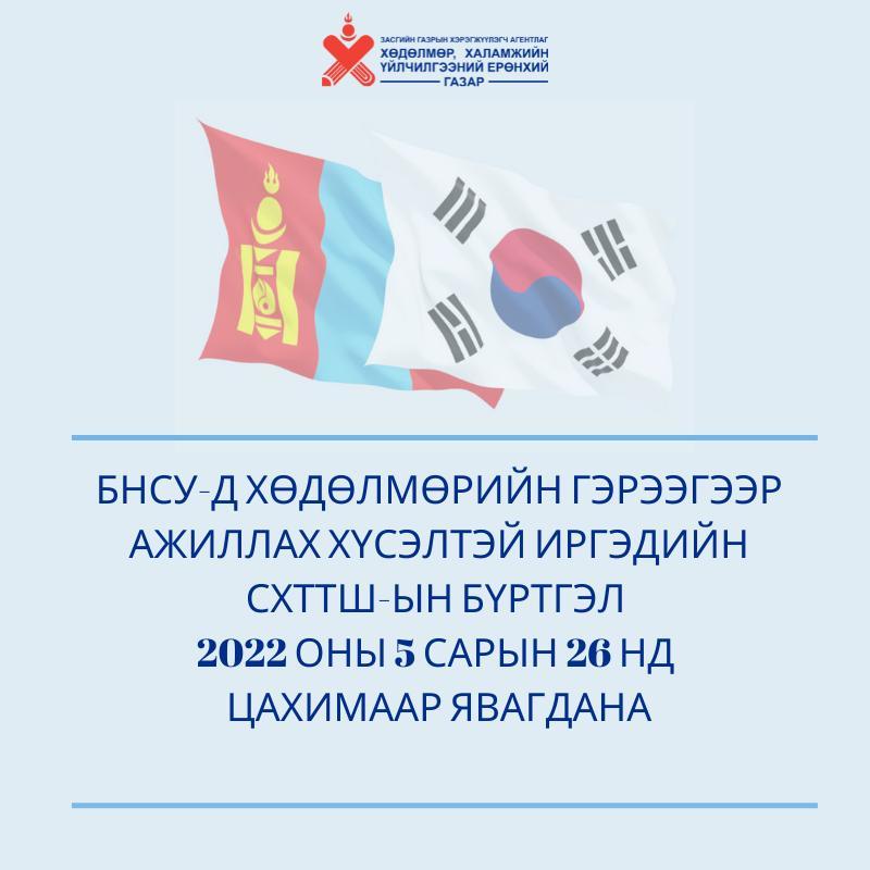 БНСУ-д хөдөлмөрийн гэрээгээр ажиллах хүсэлтэй иргэдийн солонгос хэлний түвшин тогтоох шалгалтын бүртгэл Хөдөлмөр, халамжийн үйлчилгээний ерөнхий газрын бүртгэл, мэдээллийн нэгдсэн системээр 2022 оны 05-р сарын 26-ны өдөр явагдах бөгөөд системийг 09:00 цагт нээж, бүртгэх квот дуусмагц бүртгэл автоматаар хаагдана.