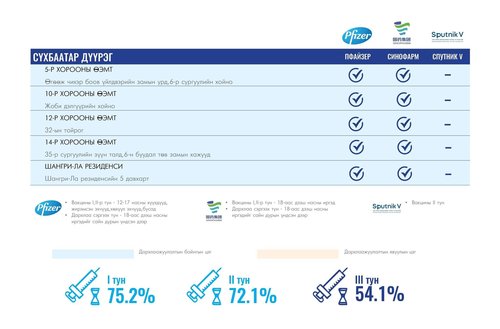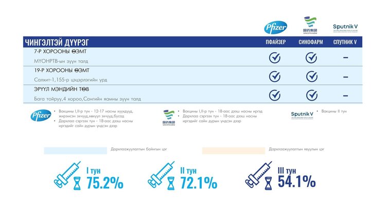 Өнөөдөр Улаанбаатар хотод суурин 37 цэг, түр 1 цэгт 38 багийн 130 эмч, ажилтан ажиллана. Та өөрт ойр вакцины аль ч цэгт очиж дархлаажуулалтад хамрагдах боломжтой. Дархлаажуулалтын цэгүүд 09:00-16:00 цаг хүртэл ажиллана.