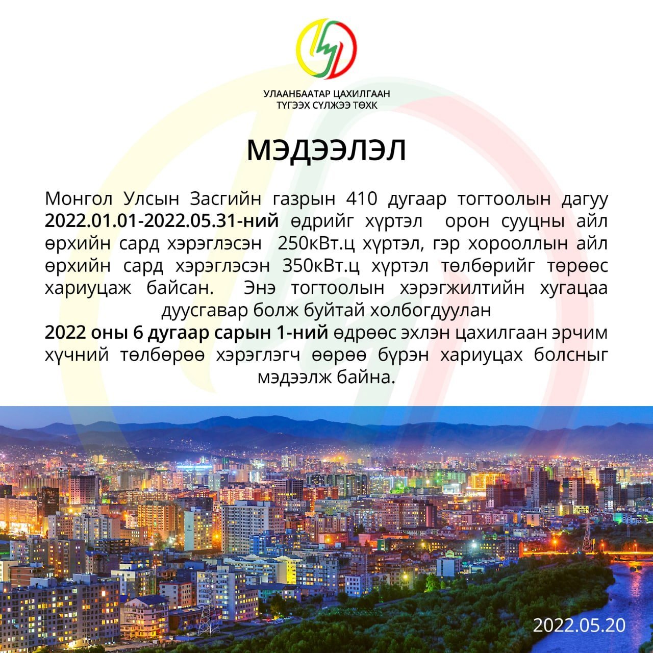 Тодруулбал, "Монгол Улсын Засгийн газрын 410 дугаар тогтоолын дагуу 2022 оны нэгдүгээр сарын 01-2022 оны тавдугаар сарын 31-ний өдрийг хүртэл орон сууцны айл өрхийн сард хэрэглэсэн 250 кВт.ц хүртэл, гэр хорооллын айл өрхийн сард хэрэглэсэн 350кВт.ц хүртэл төлбөрийг төрөөс хариуцаж байсан. Энэ тогтоолын хэрэгжилтийн хугацаа дуусгавар болж буйтай холбогдуулан 2022 оны зургаадугаар сарын 01-ний өдрөөс эхлэн цахилгаан эрчим хүчний төлбөрөө хэрэглэгч өөрөө бүрэн хариуцах болсныг мэдээлж байна" гэжээ.