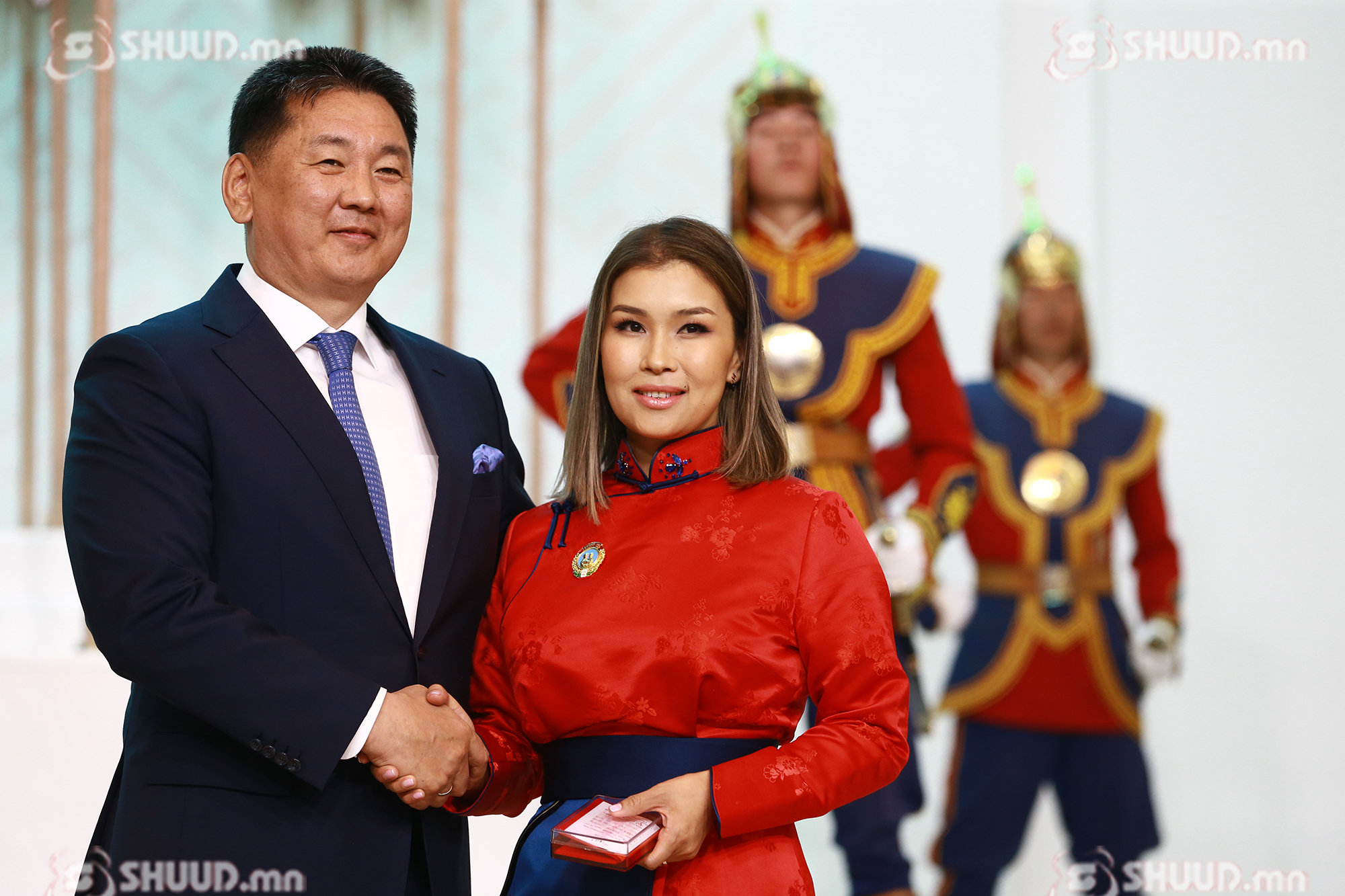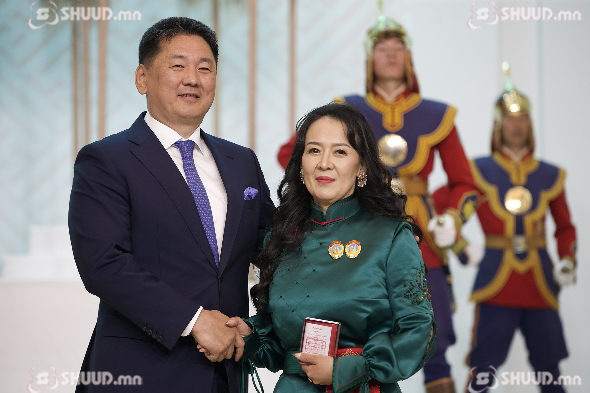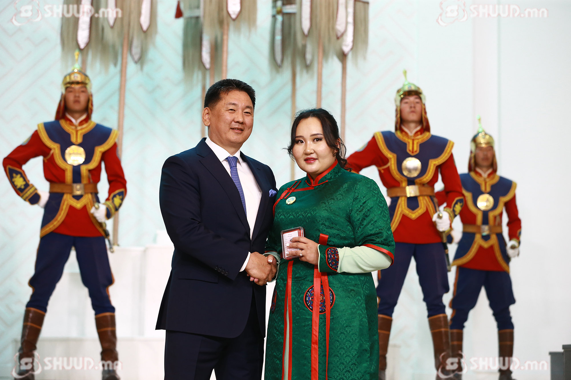 Монгол Улсын Ерөнхийлөгч У.Хүрэлсүх "Эхийн алдар" одон гардуулж байна. “Эхийн алдар” I, II зэргийн одонг Б.Баасанжаргал, Г.Ганцэцэг, Ч.Золжаргал, Т.Золзаяа нарт хүртээлээ.